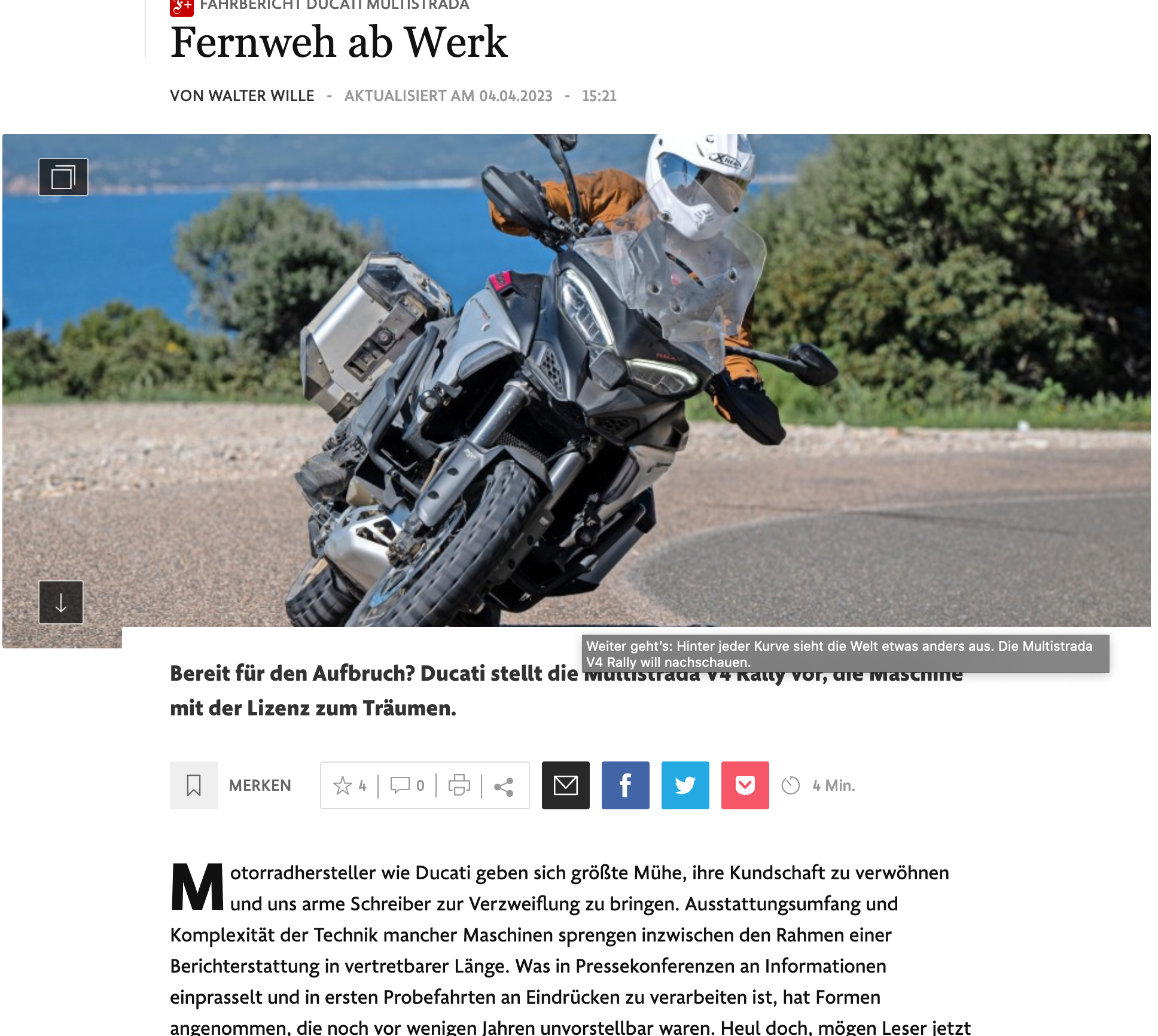 Die FAZ hat heute in der Beilage Technik und Motor die Multistrada 4 Rally gelobt.