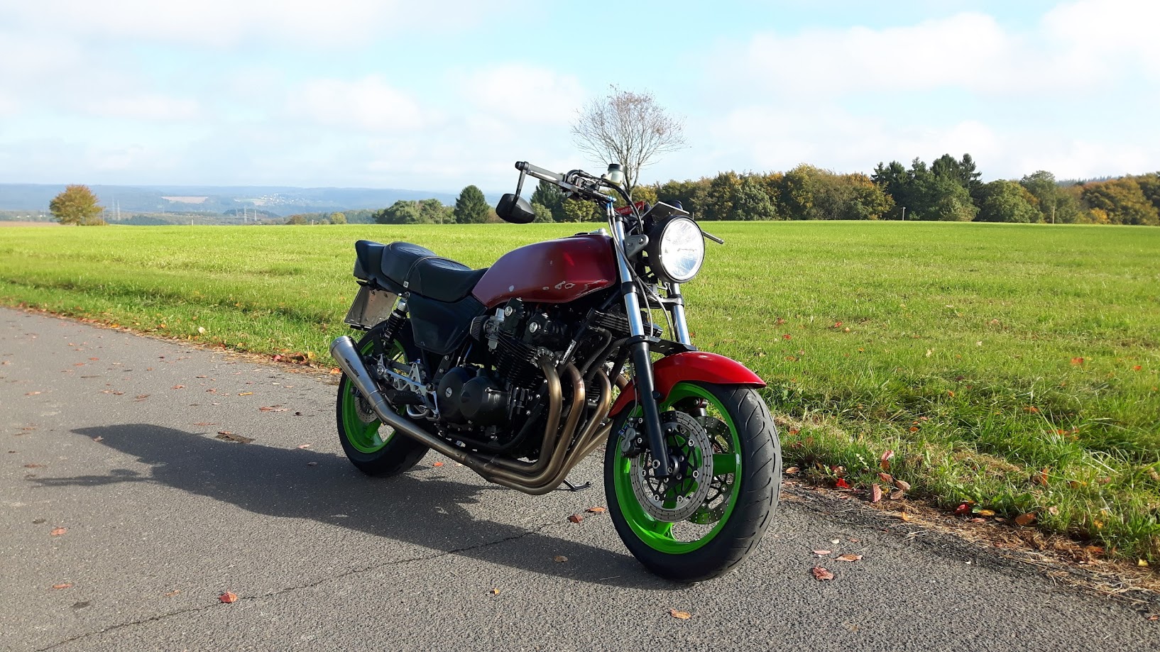 Umbau auf eine R100R-Gabel, breiteren Felgen mit Radial-Reifen und auf mich