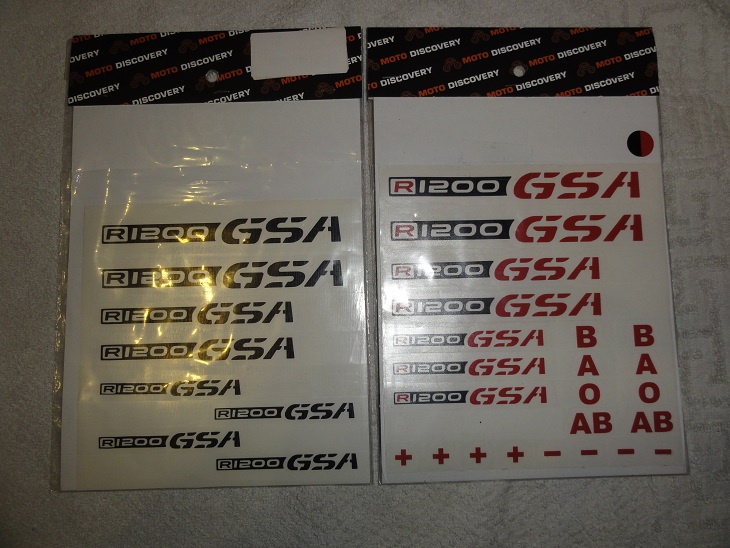 5.) zwei Bögen "R 1200GSA"-Decals (Aufkleber) auf Trägerfolie (das bedeutet, dass nach dem Aufkleben nur der Schriftzug stehen bleibt). An dem rot/schwarzen Bogen fehlt ein Aufkleber - schaut aber an einer schwarzen GSA nicht aus, deshalb der Verkauf. 5,- Euro komplett