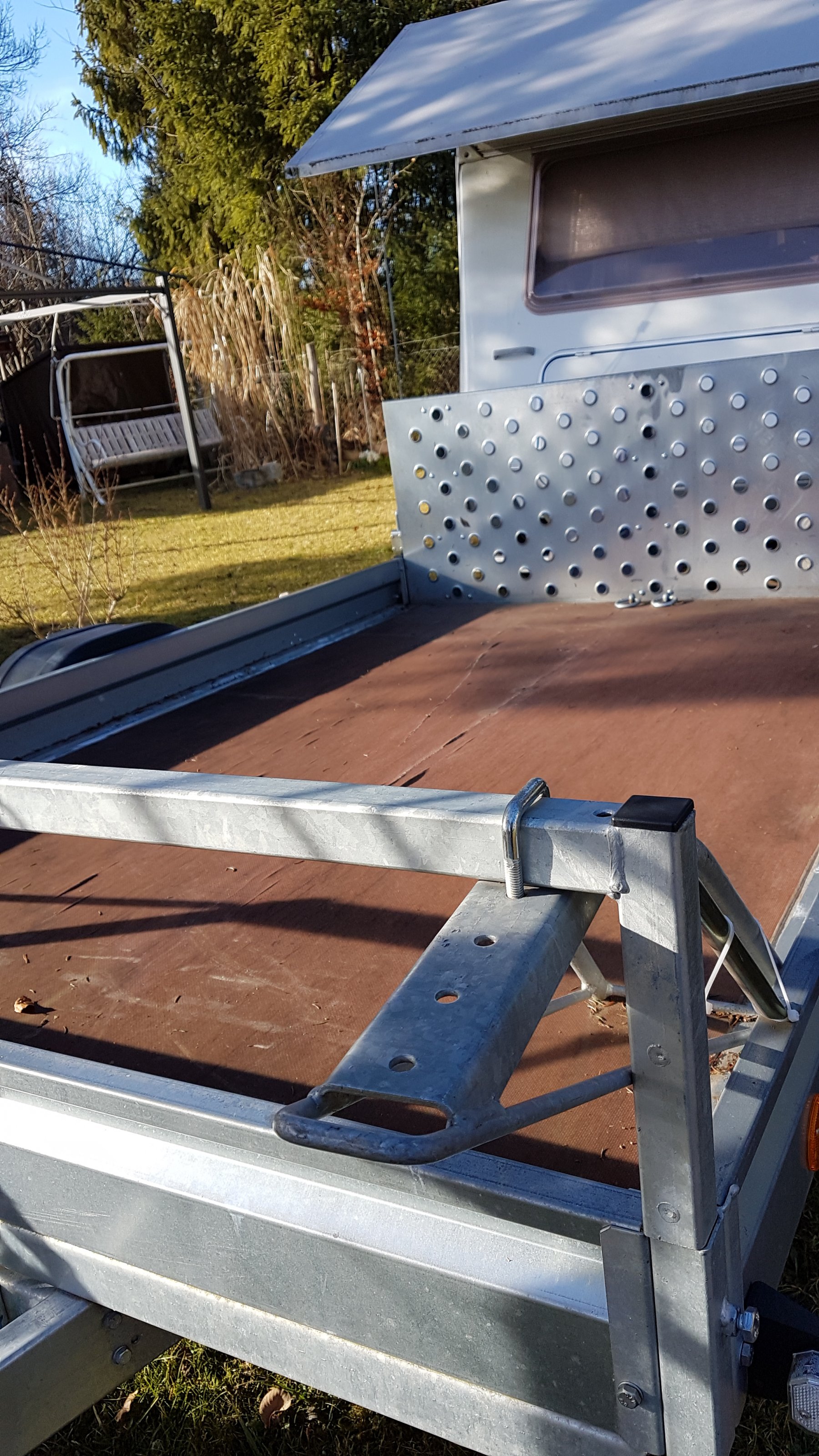 Reling und Vorderradhalter sind ebenso vorhanden. 1300 kg Gesamtgewicht. 970 kg Nutzlast. Breite 2,20 m