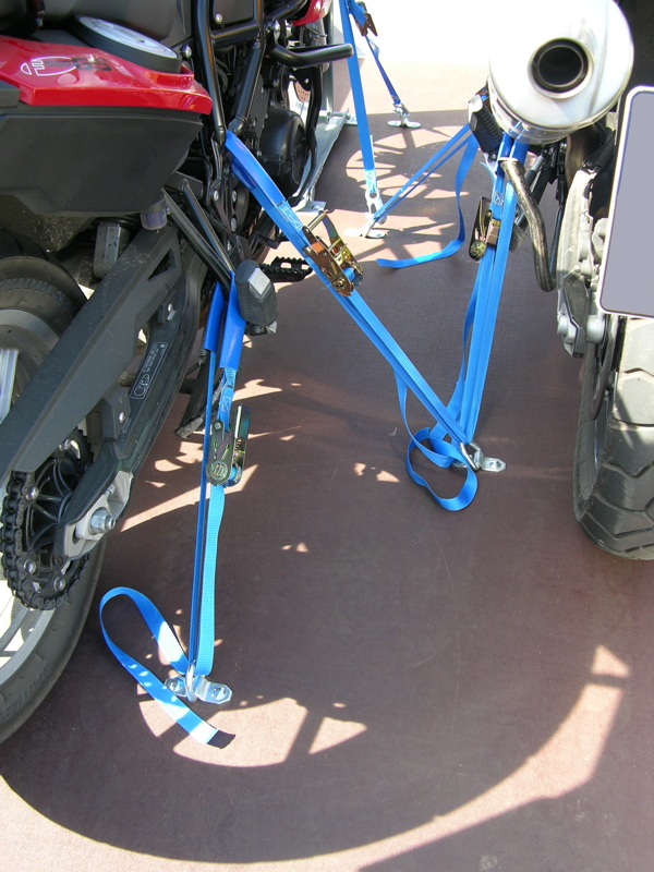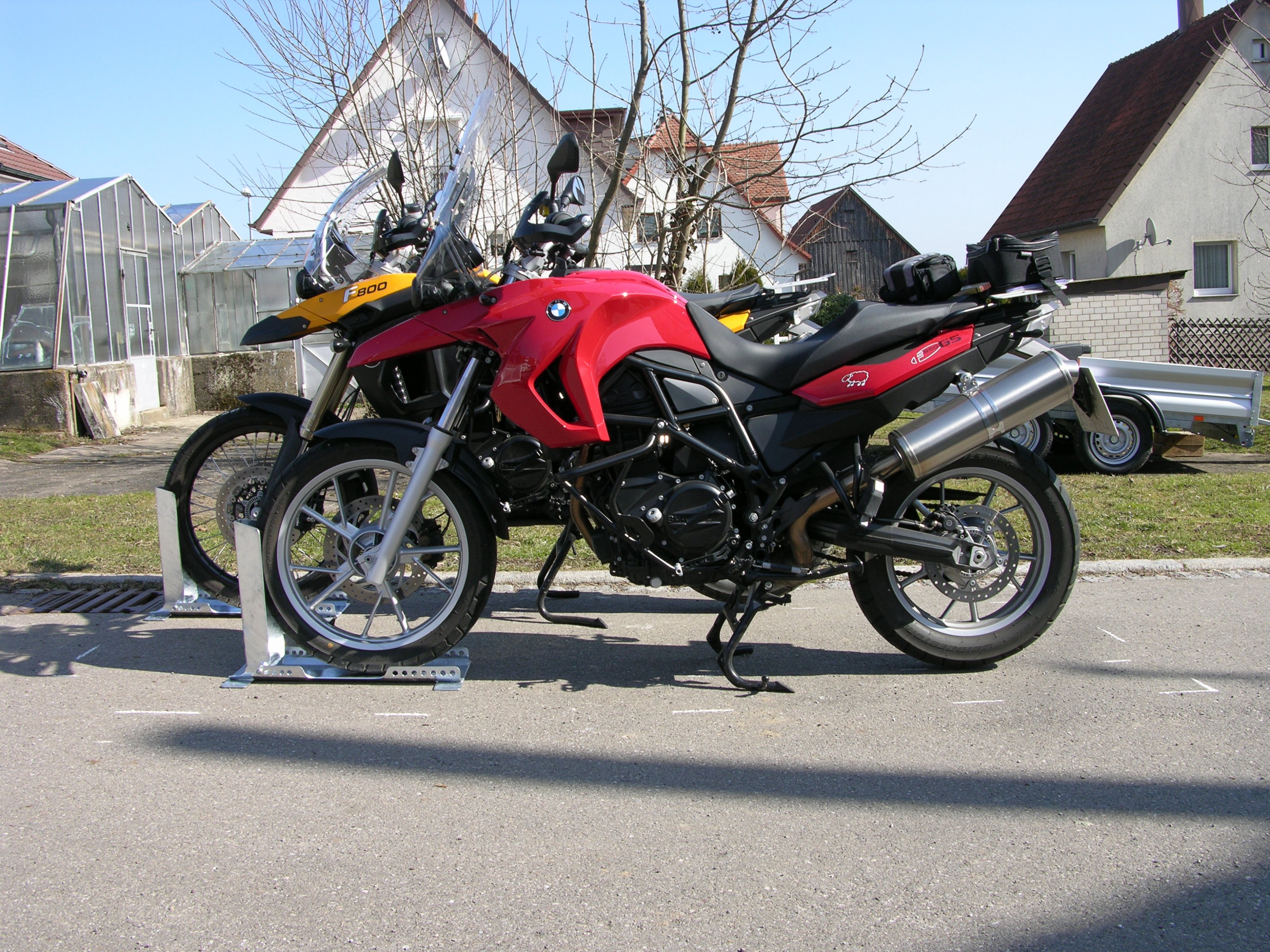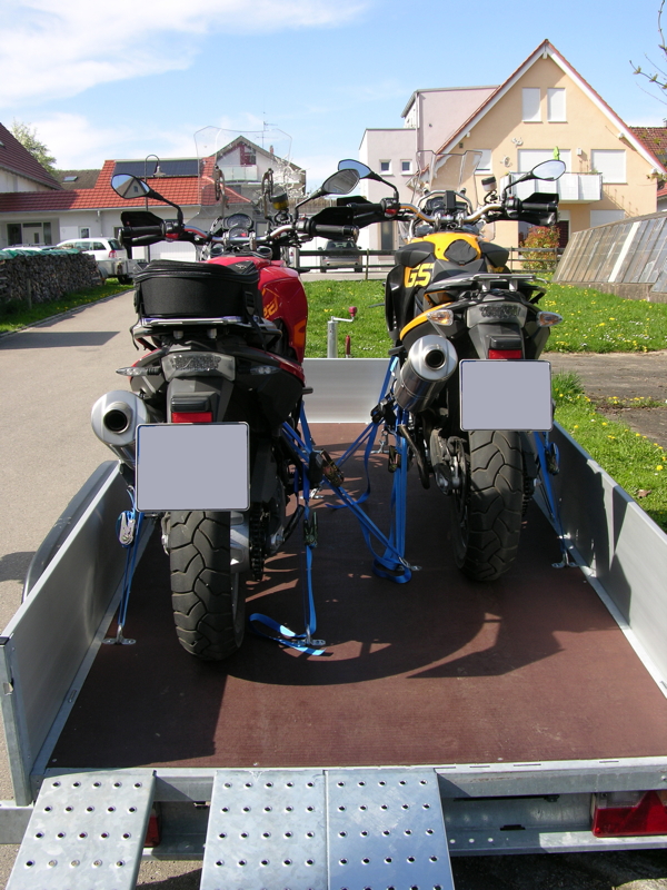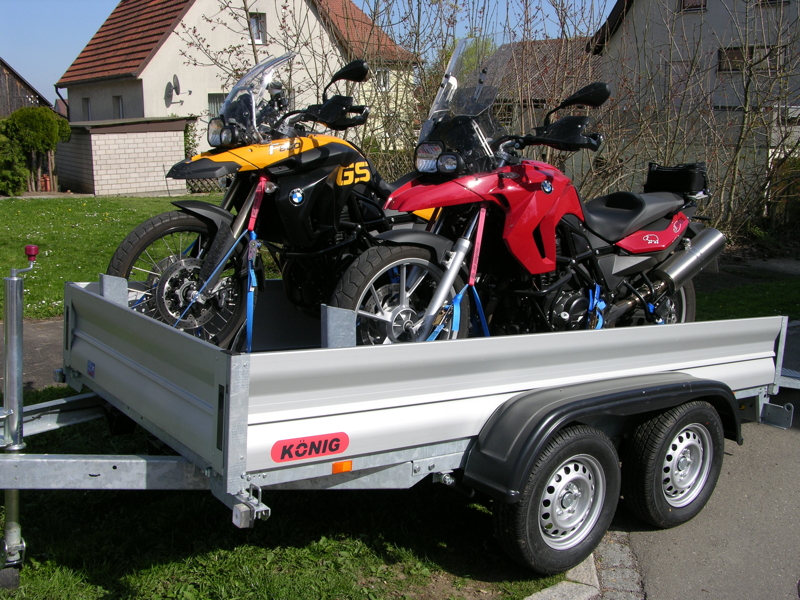 Ich habe leider nur Bilder mir den F's-Moped's, aber es passen problemlos (unsere jetzige Konfiguration) 1x R1200GS und 1x F650GS drauf. Bei der Planung der Motorrad-Ständer auf der Ladefläche habe ich 2x R1200GS'en berücksichtigt.