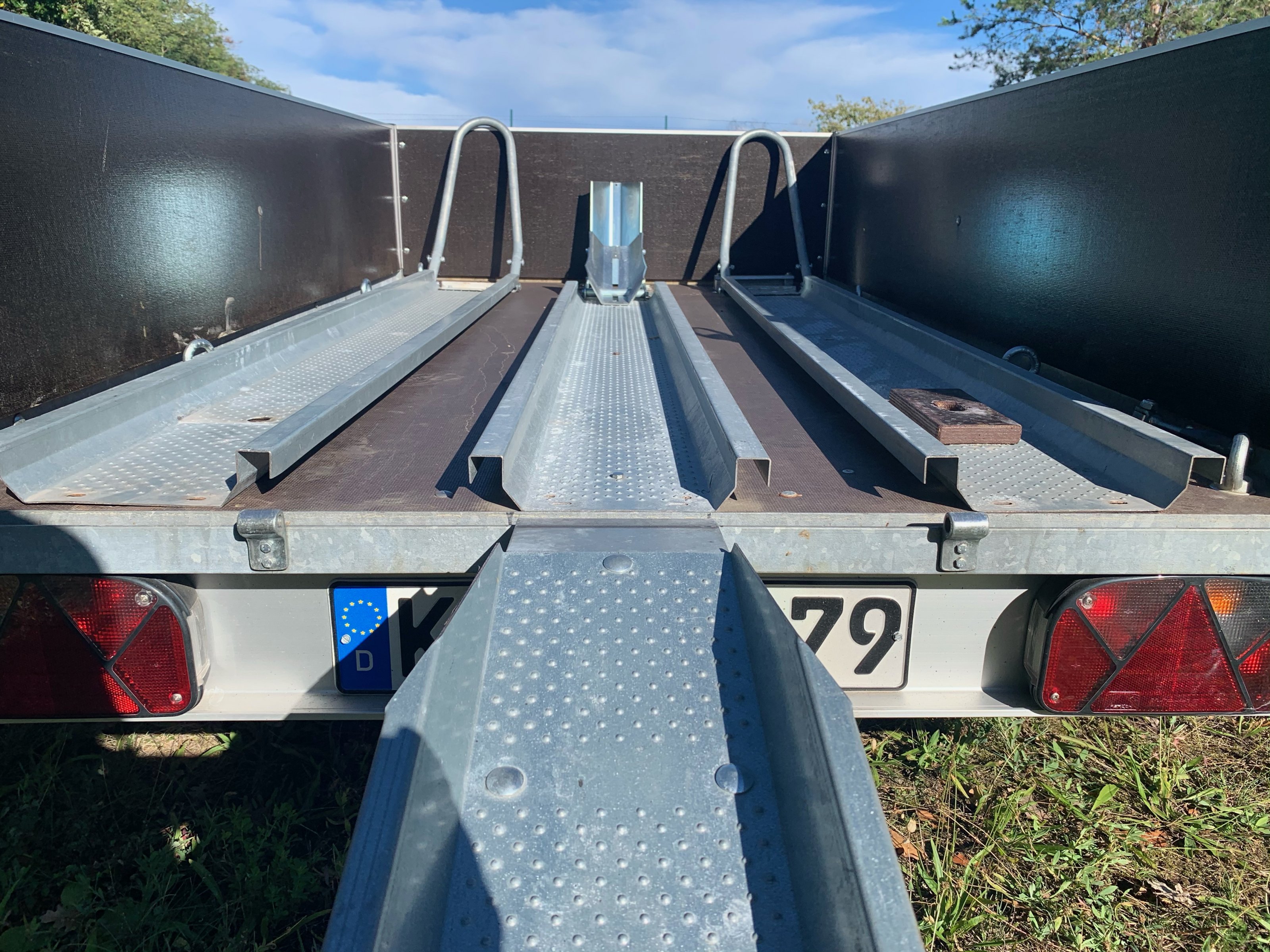 Der Pkw-Anhänger ist von der Fa. Kröger, besitzt eine Auflaufbremse, ist für 2 Motorräder ausgelegt und hat die 100 km/h Zulassung