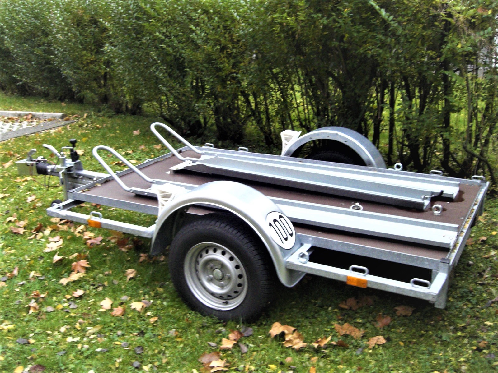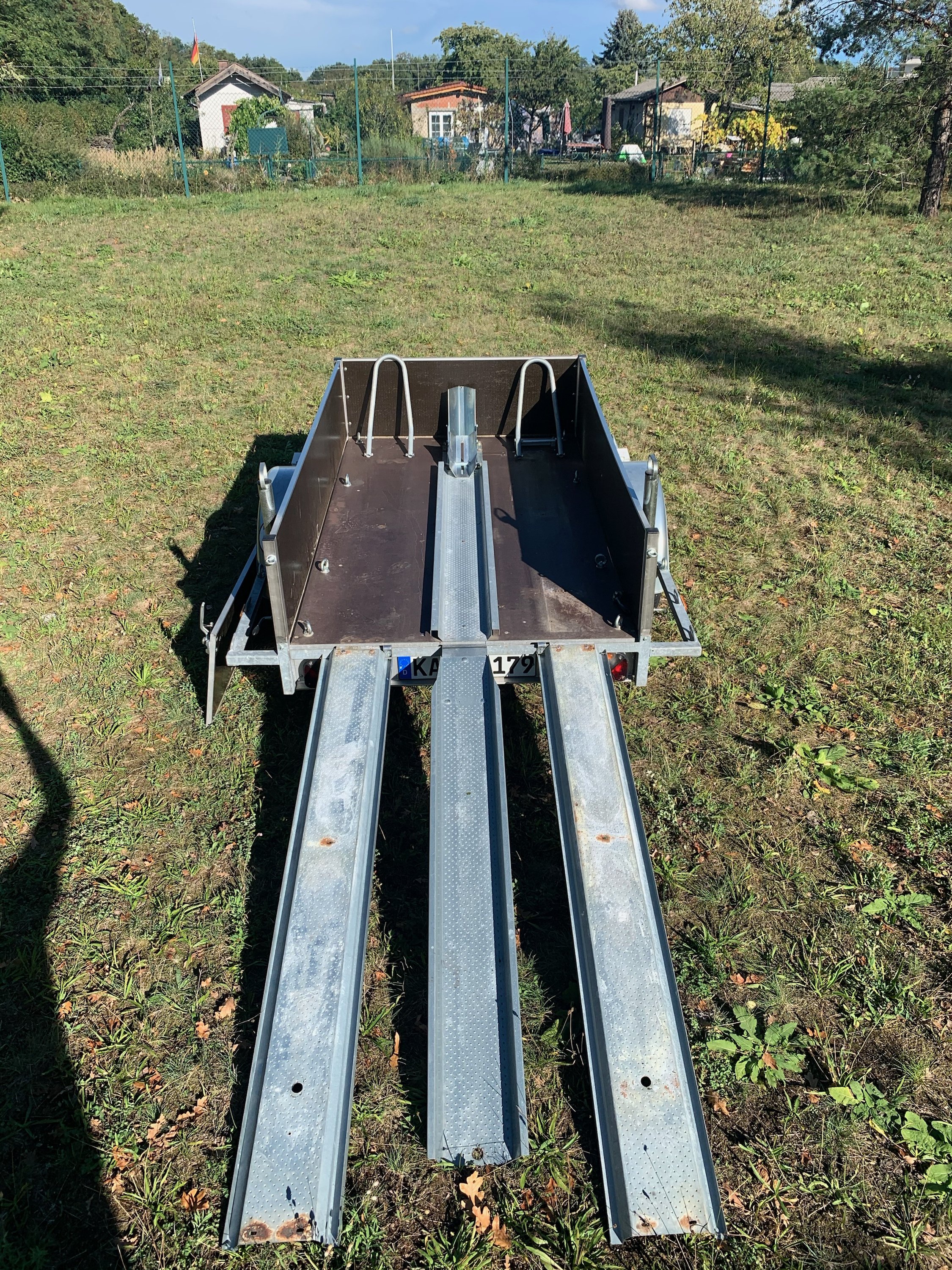 Ich habe auf dem Anhänger immer nur 1 Mopped transportiert und ihn deswegen so umgebaut, dass ich das Mopped alleine auf- und abladen kann.
