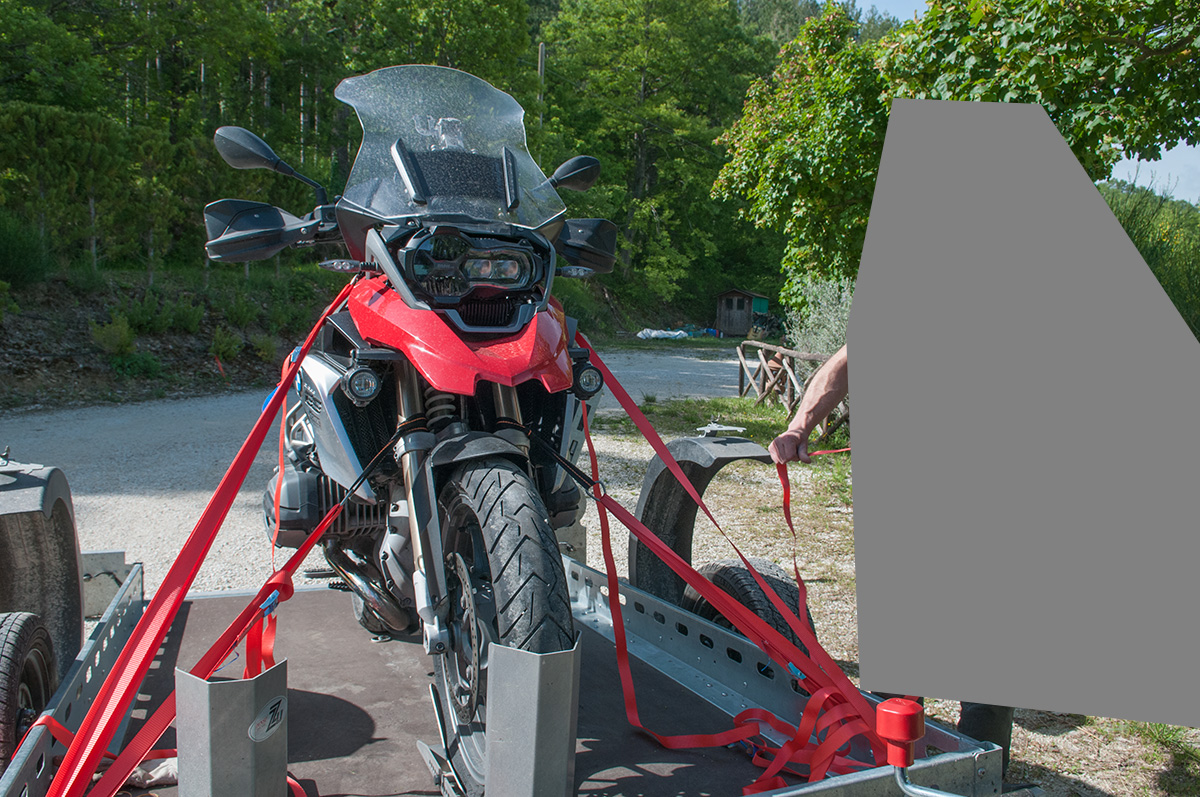 Die Rampe wird mittels Schrauben während der Fahrt an der Bordwand befestigt. Die 2weissen und 2 schwarzen Dropse aussen an der Bordwand. Beim Motorradtransport muss die Heckklappe entfernt bleiben.