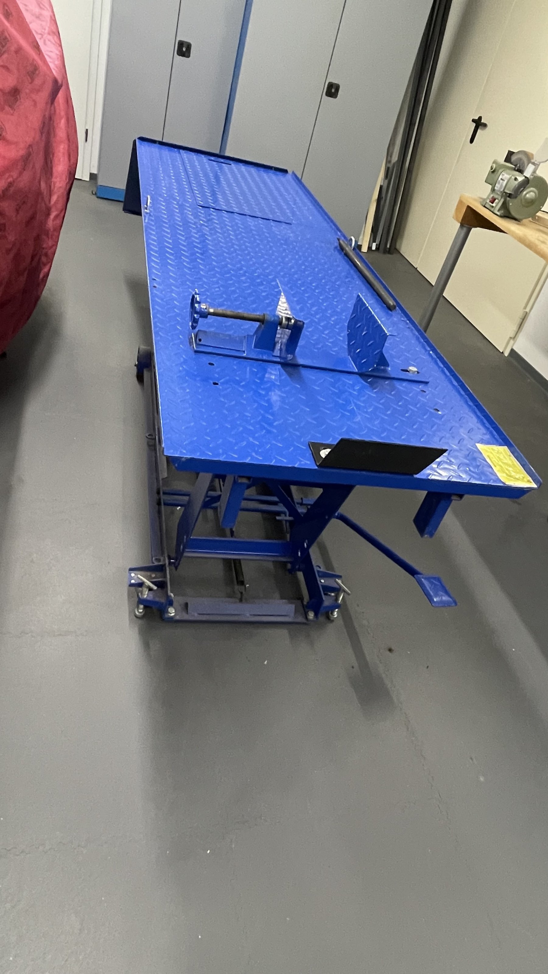 Damit das Teil trotz Rollen stabil steht (und das tut sie! Meine 1200RT, 1250GS oder auch die 1300GS stehen bombenfest auf der hochgefahrenen Hebebühne) sind an Auslegern verstellbare Stahlstützen angebracht, die man herunter dreht bis die Rollen entlastet sind.