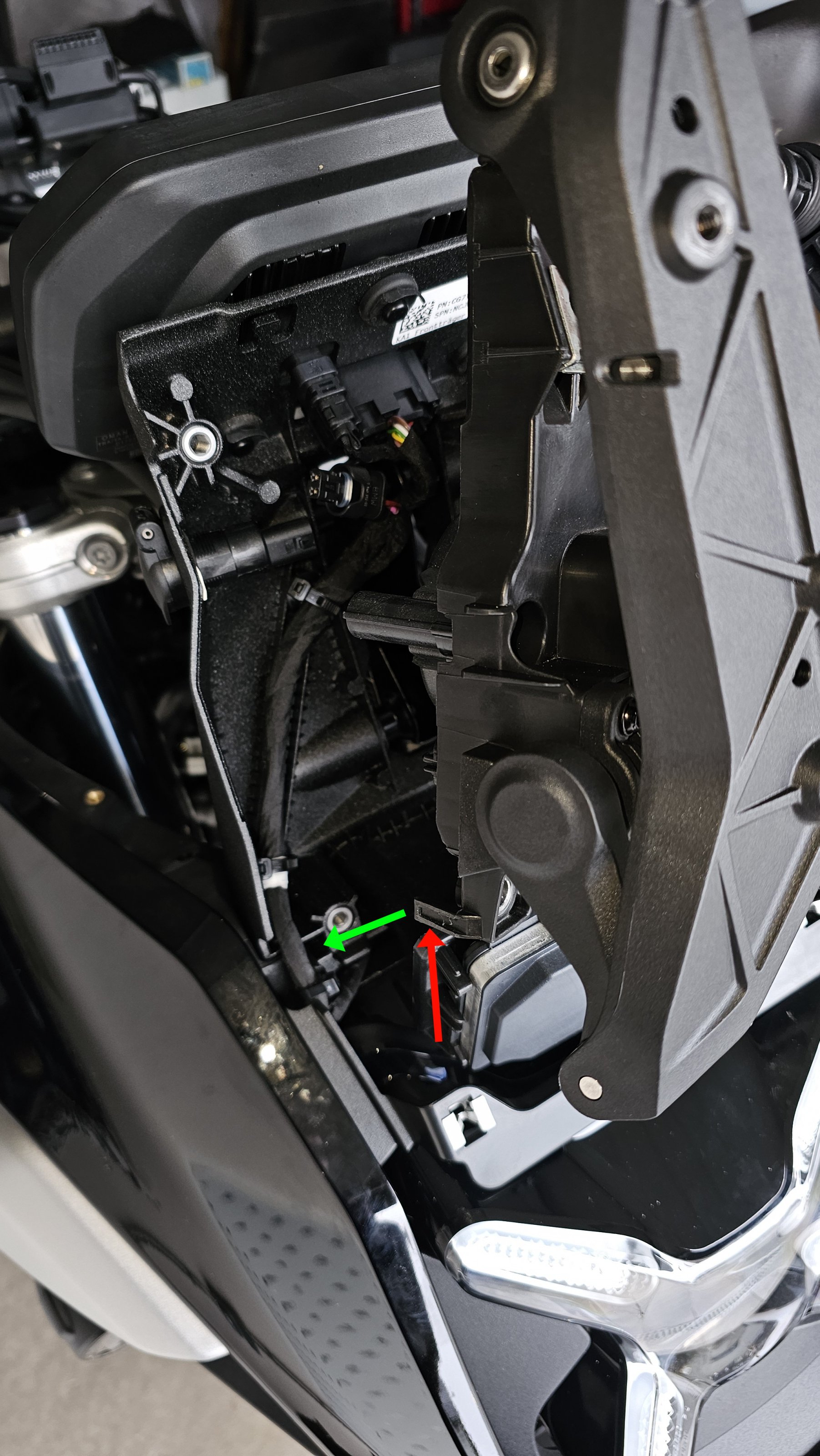 Jetzt den Träger nach vorne wegkippen. Er wird unten noch festhängen, da sind an beiden Seiten Führungslaschen, die an den verlegten Kabeln hängen bleiben. Ist aber kein Problem, einfach vorsichtig raus ziehen. Beim Einbau hakt es an genau den zwei Stellen wieder. Einfach vorsichtig wieder einschieben. Rechte Seite im nächsten Bild markiert, mit Blick auf die nun zugängliche Cockpitsteckdose. Grüner Pfeil: da muss das Ding rein.
