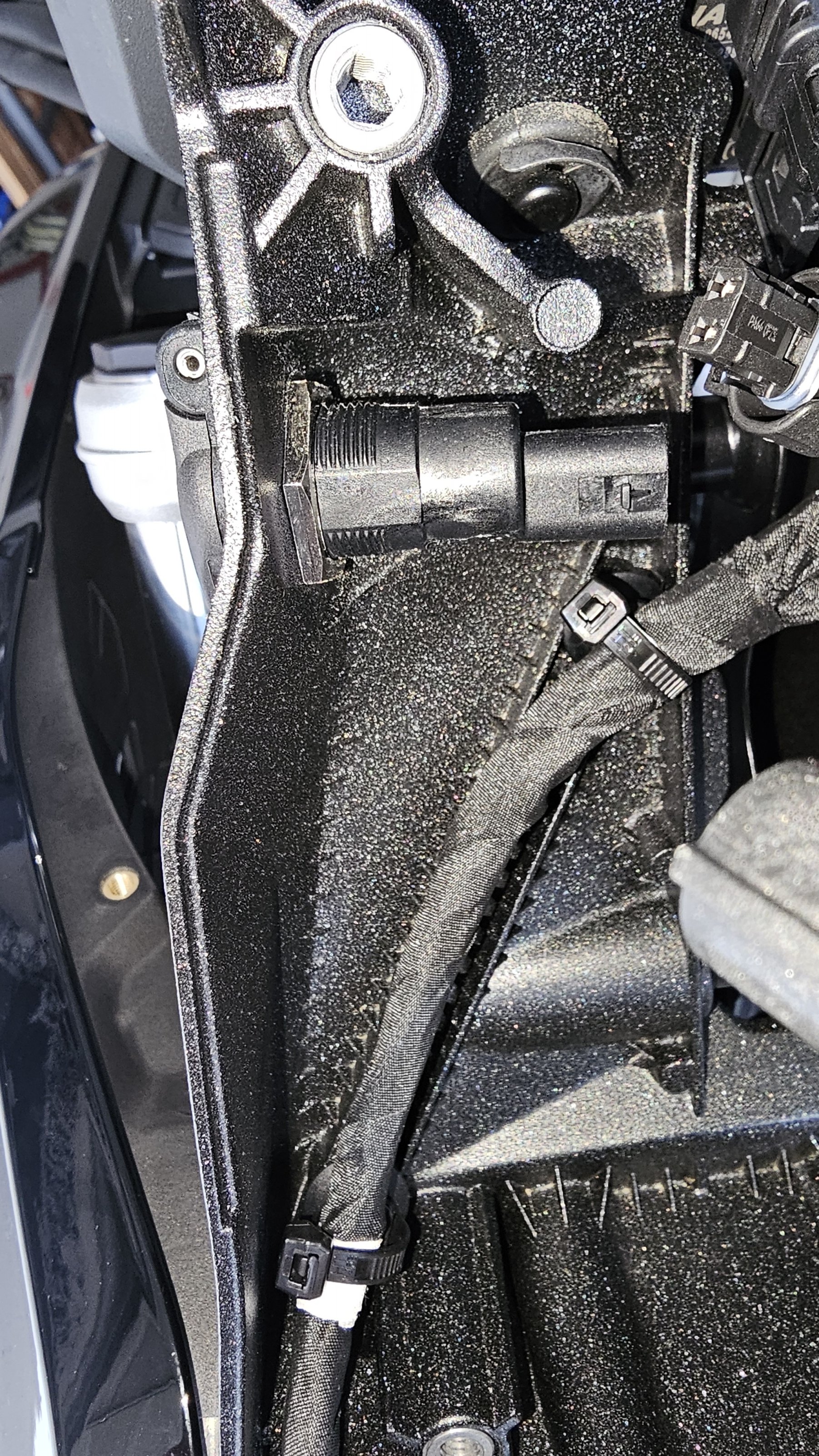 Los geht's mit der offen Ansicht auf die Steckdose. Das Navikabel ist mit Kabelbindern festgezogen. Die habe ich wegen besserer Beweglichkeit geöffnet.