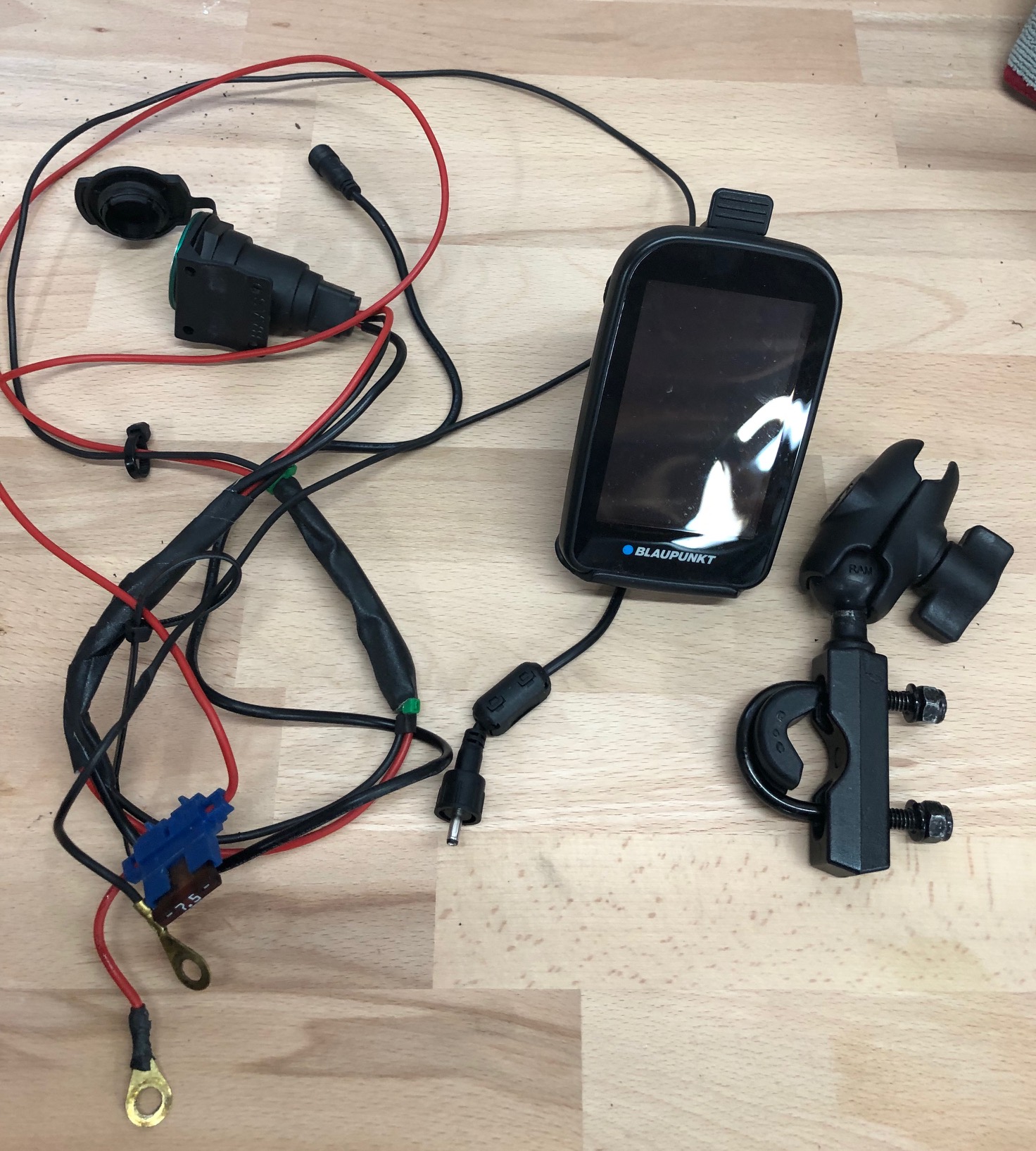 Ich möchte gern mein Navi verkaufen. Blaupunkt Motopilot, mit RAM-Mount Halterung für den Lenker und Anschlusskabel an die Batterie. Der Kabelbaum ist mit einer externen Steckdose (war auch am Lenker) verlötet. Die Steckdose funktioniert, leider schließt der Deckel nicht mehr richtig. Es ist nur dabei, was auf dem Foto zu sehen ist. Anleitung und USB-Kabel fehlt.