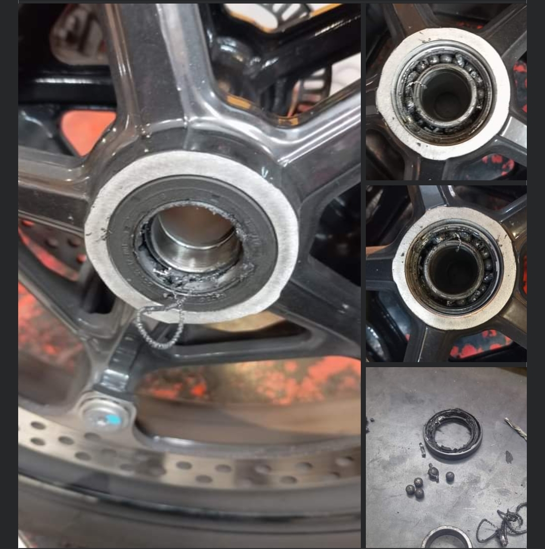 This happened to us with the R1300GS in our fleet. The bike has only 6,000 km. It was picked up from the dealer and had its 1,000 km check-up done by an official BMW dealer. Nothing was touched on the front or rear axle as the tyres are still in good condition after only 6,000 km. This happened at 50 km/h, I don't want to think what could have happened if we had ridden on the motorway at higher speeds. After the bearing broke, the bike logically couldn't be ridden at more than 30 km/h. I've never been a fan of GSs but I've been in love with the 1300 so far, much more fun and agile than the previous models. It seems like a great bike to me and my clients. But these things shouldn't happen, especially knowing that our case is not isolated and there are users who have had it happen after only 4,000 km. Guys, if you hear any noise or feel any vibratuons from the front, please remove the wheel and check your ball bearings.