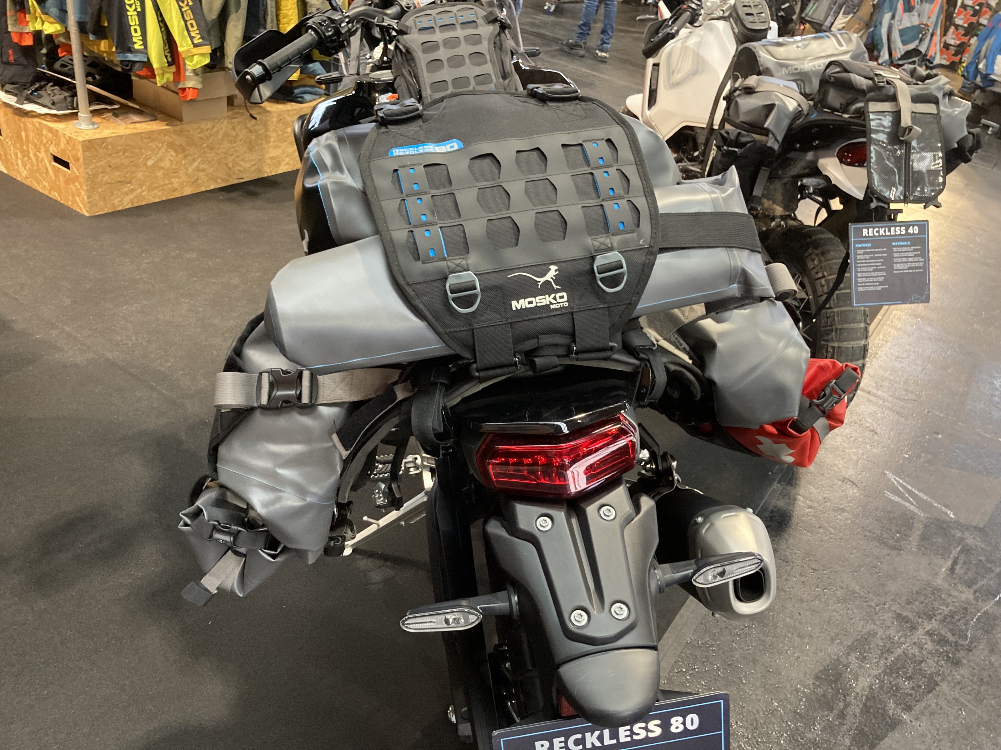 Wenig beladen, hängt alles rum und ist kaum in den „Revolver“ zu schieben, keinerlei Diebstahlsicherung, ohne Baugerüst schubbert der Straßendreck den Lack ab. Dazu zig Gurte & Ösen an denen sich der Dreck sammelt. Sozia passt idR auch nicht mehr.