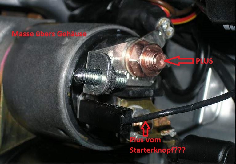 Kannst aber auch Plus per Starthilfekabel an die andere Kupferschraube/Mutter dranlegen. Dann läuft Motor direkt. Ohne Magnetschalter. Dann brauchst Du am Anschluß mit dem schwarzen Kabel nix.