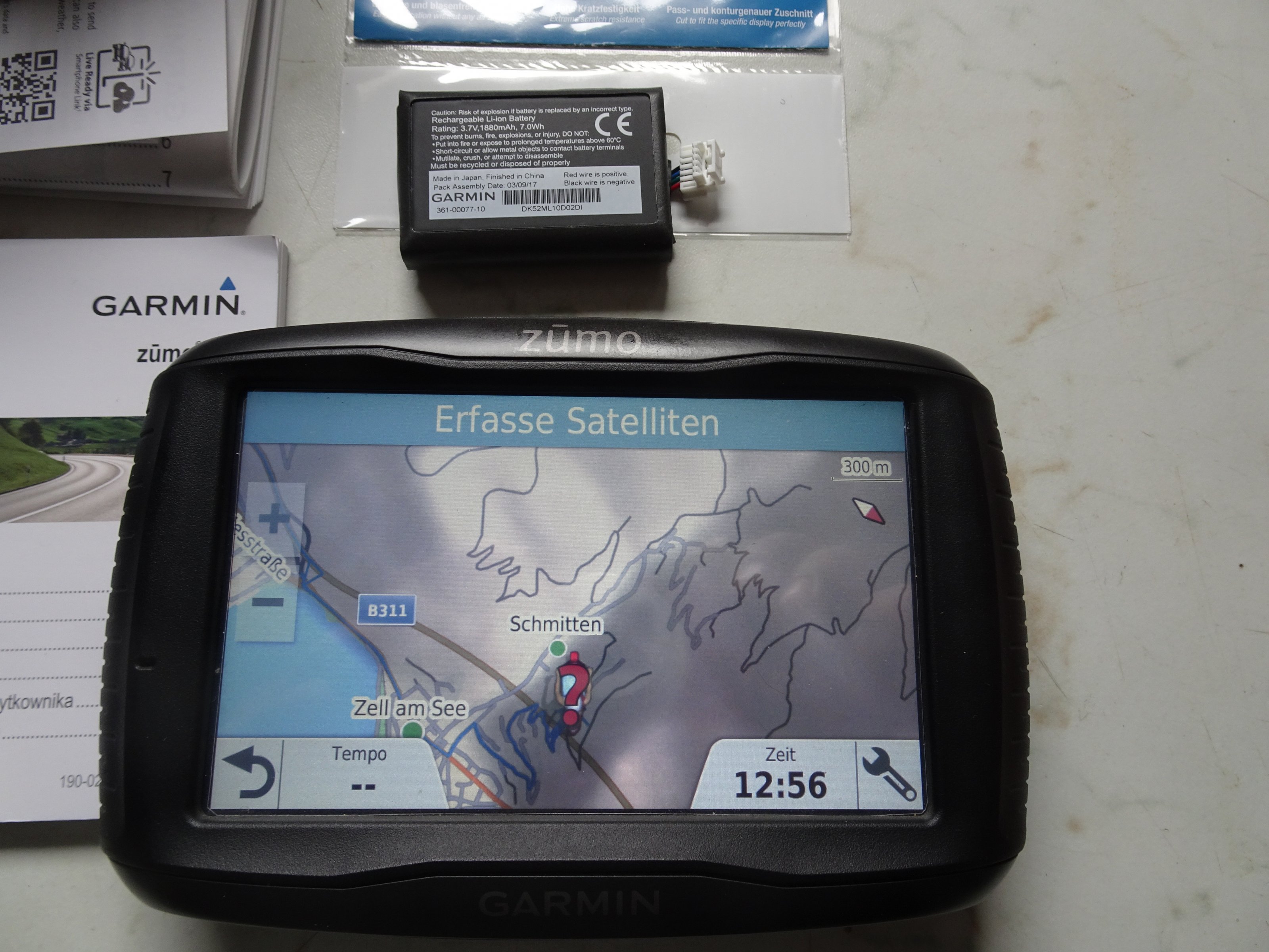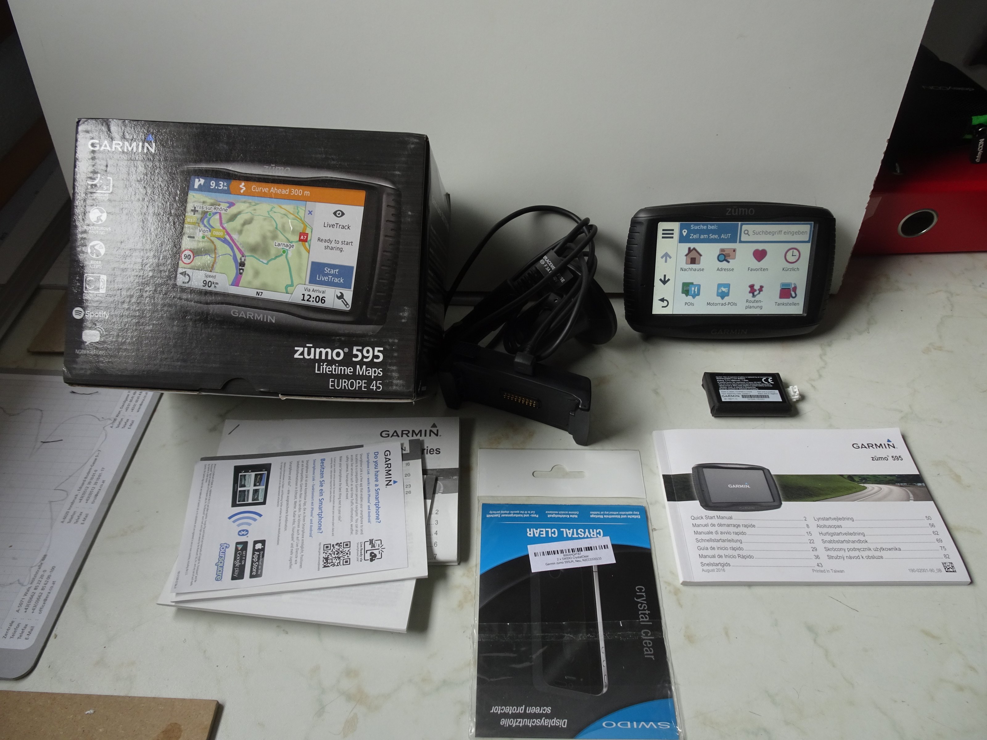 Ein zweiter Akkupack, Kabel mit Kfz Halterung, natürlich das Kabel mit Halterung für das Motorrad und die Originalverpackung sind dabei.