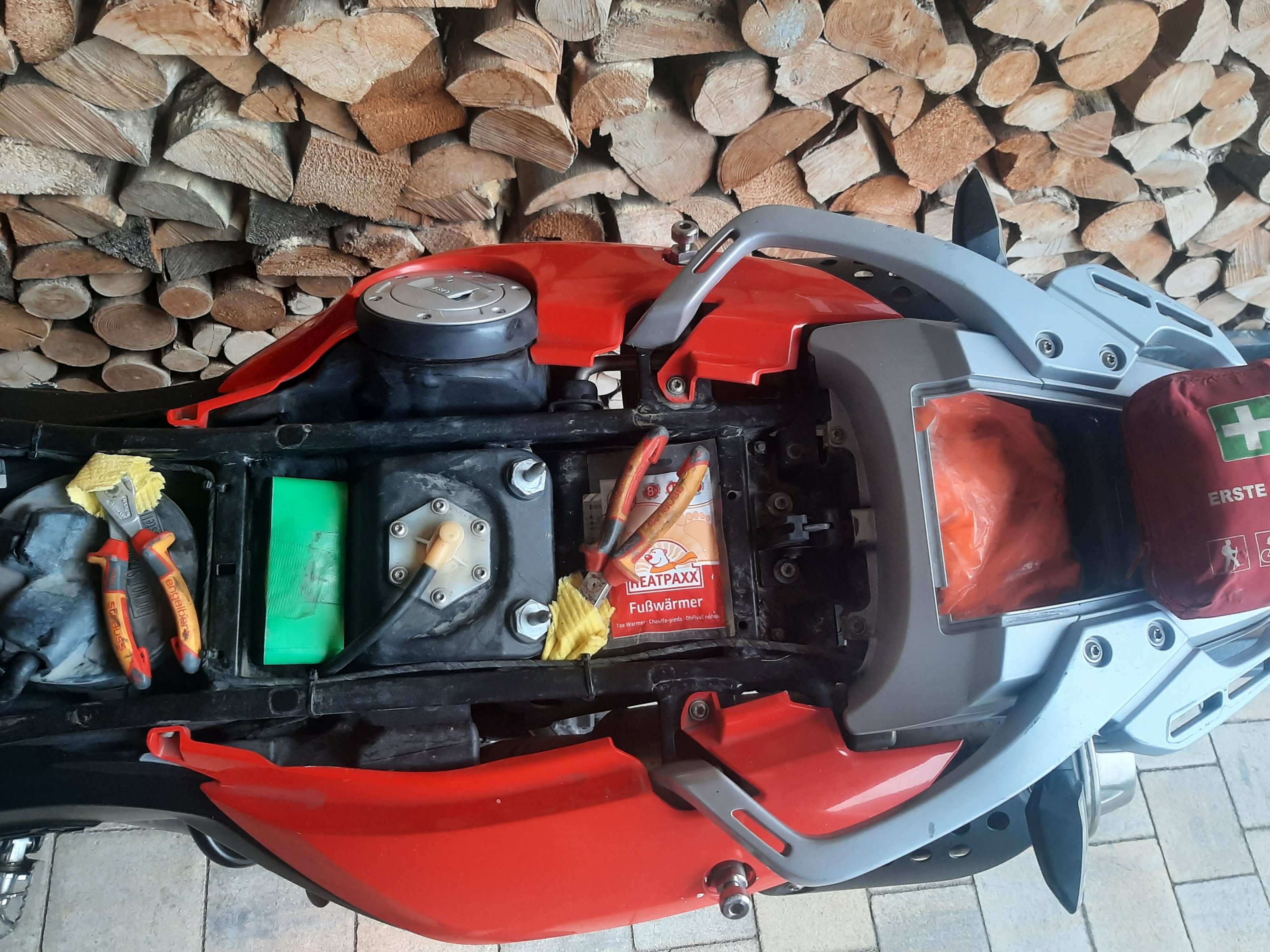 Kettenfett wird bei mir eine Spraydose (muss ja nicht voll sein) schick lackiert und mit elastischem Klett an der Fußraste fixiert. War ein Geistesblitz vor der Nordkapptour. Hat bisher ca. 15.000km auf Reisen gehalten.