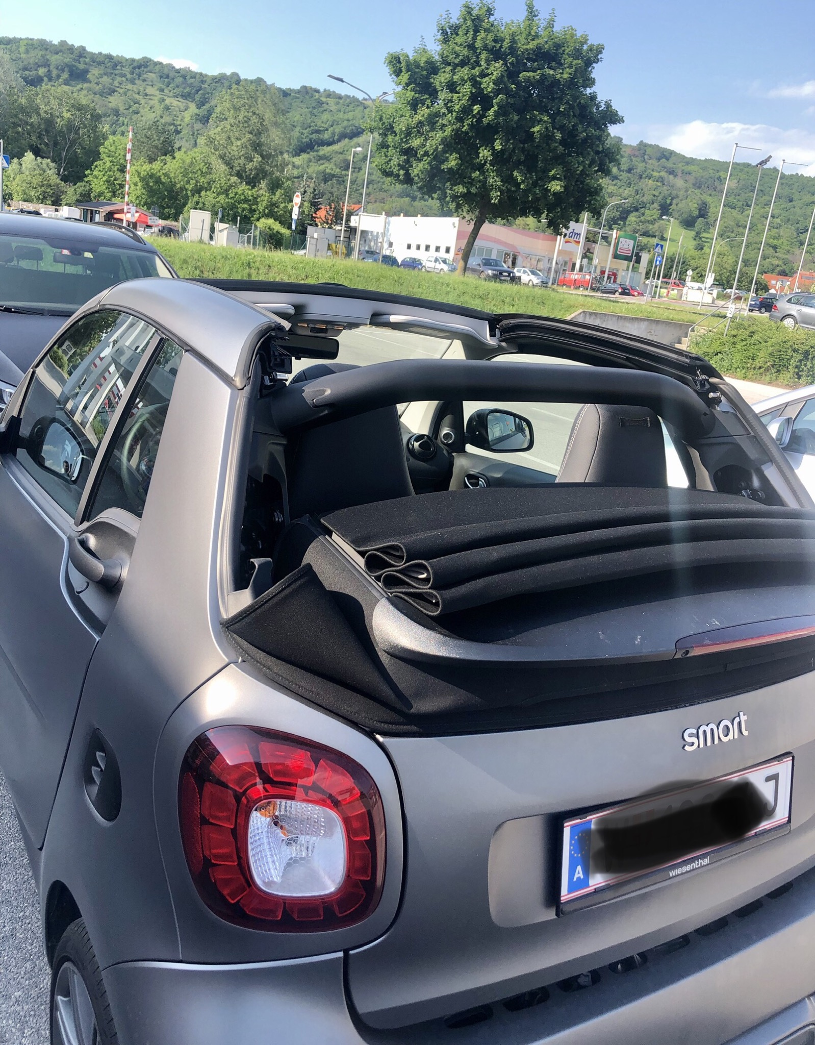 Mit so schönen Hintergrundmotiven und so eleganten Convertibles können wir nicht aufwarten, dafür haben wir einen reinen Zweisitzer 😉, mittlerweile 13 Monate alt. Ein Smart in der Brabus Edition. Navi, Rückfahrkamera, Armaturenbrett aus Leder, Sportfelgen/Reifen, Sitze und Fahrwerk, DSG, Verdeck natürlich elektrisch. 170 haben wir (in dem Fall nur ich...) schon ausprobiert, läuft absolut ruhig und spurstabil, ein bissl geht noch 😜 Man kann auch mit den Kindern zum Baden fahren...