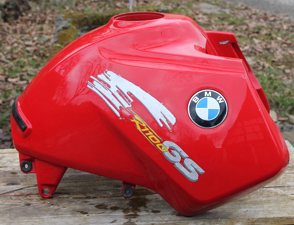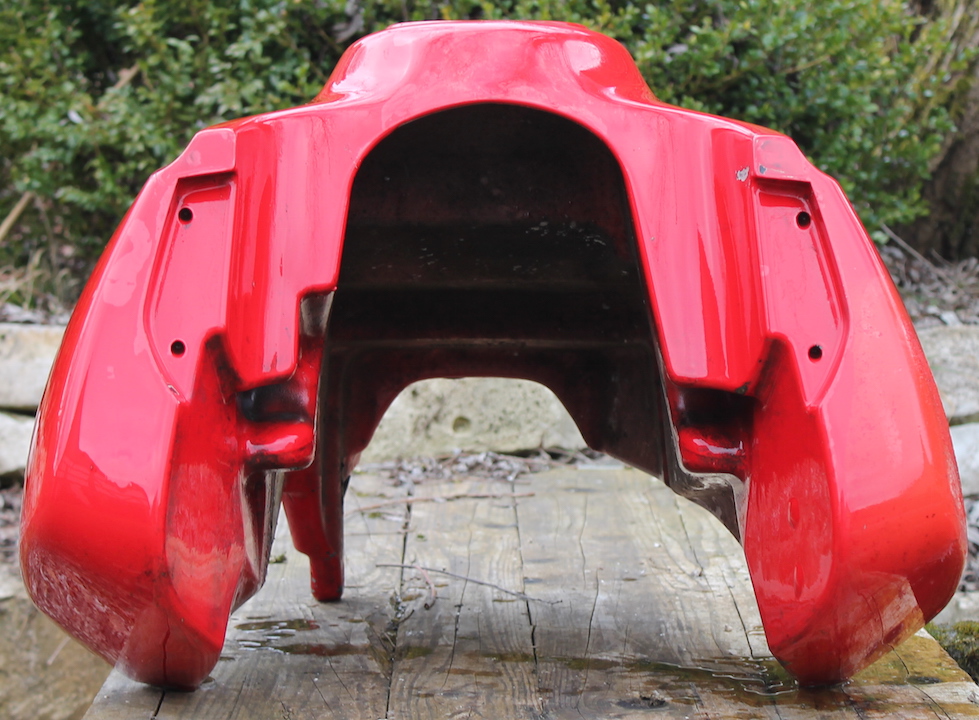 Hier mein Originaler Kunstoff Tank mit diversen Lackschäden, an der linken seite hat er Kroatischen Asphalt maltätiert, nicht schön aber er ist Heile und Dicht. Konnte einen anderen roten in der Bucht steigern, somit erspare ich mir die