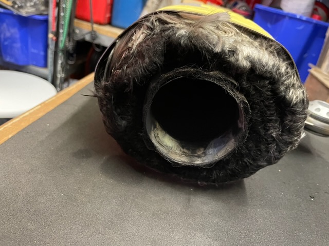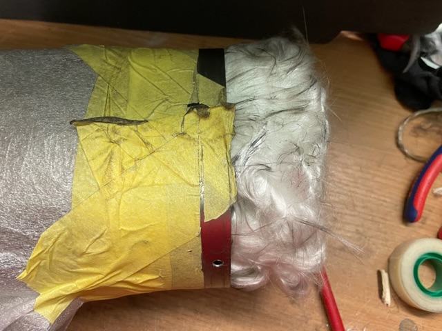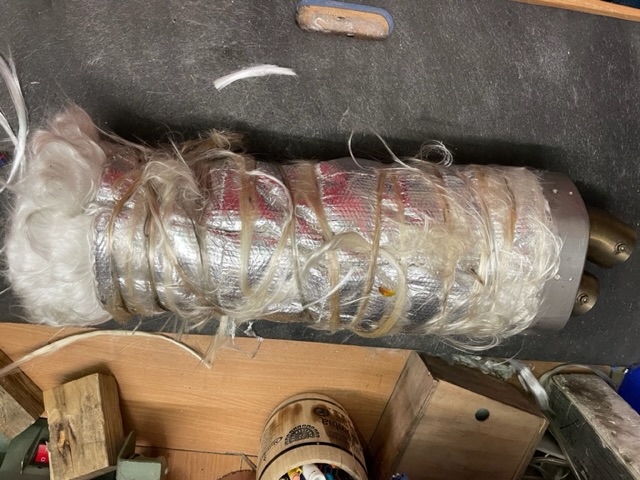 Dämmwolle war schwarz, hart, sah aber augenscheinlich noch gut aus. Sie war stramm um das Siebrohr gewickelt und mit einer Art “Dämmkordel„ komplett verzurrt.