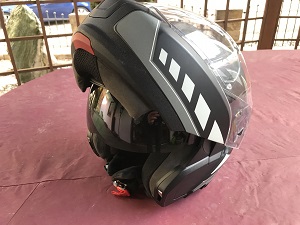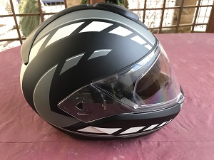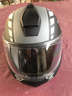in den Farben schwarz matt und Grau matt mit weis matten Streifen und einer Intigrierten Sonnenblende mit einem Doppelvisier gegen Beschlag und anlaufen.