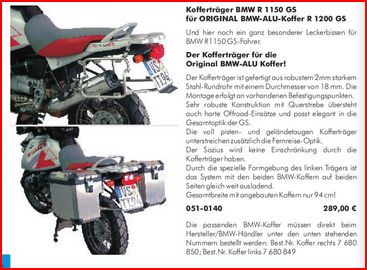 möchte gerne an meine zukünftige R1150GS Adventure die original Alu-Koffer von der R1200GS Adventure montieren. Von Touratech bekommt man eine entsprechende Kofferaufnahme.