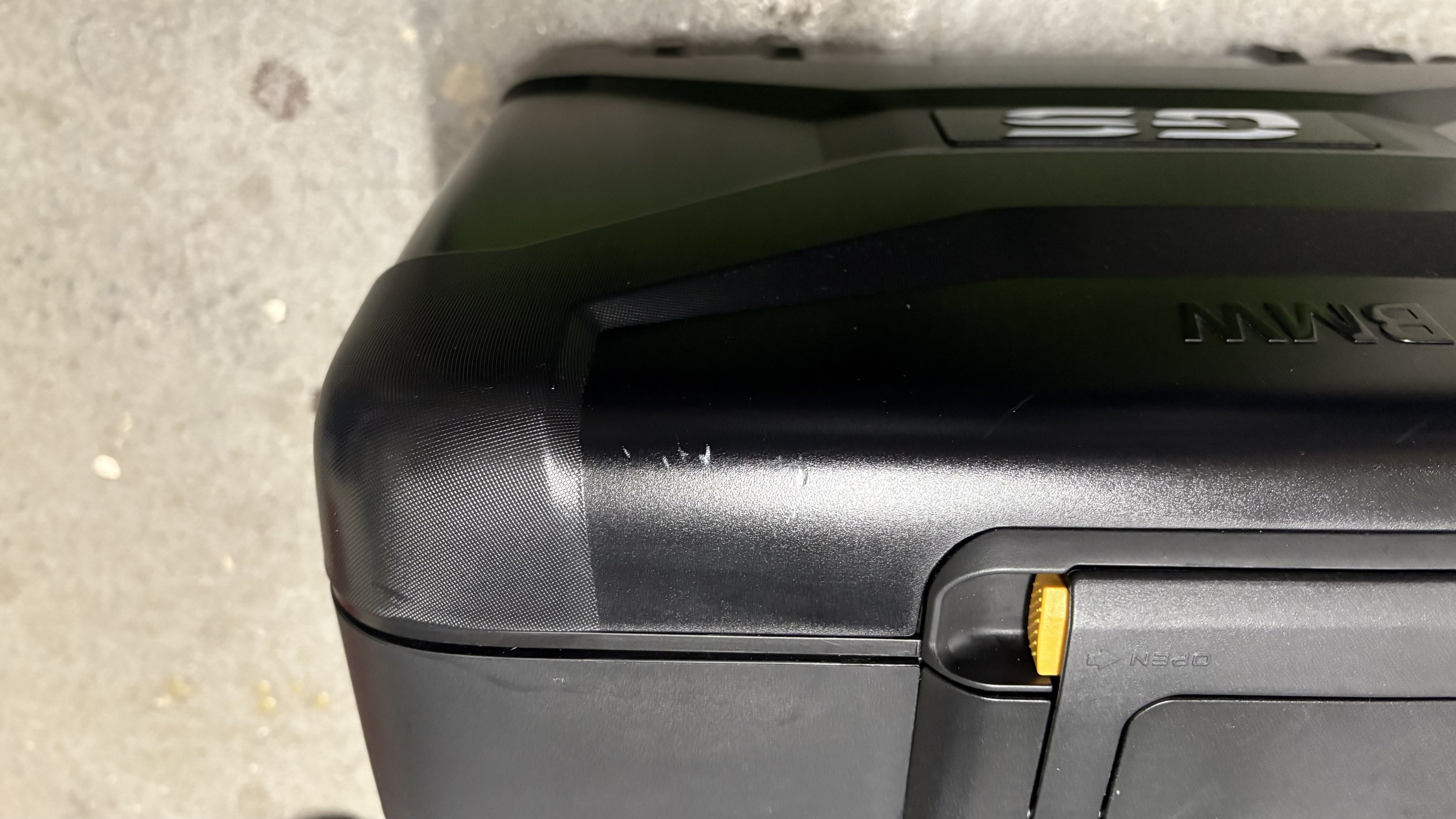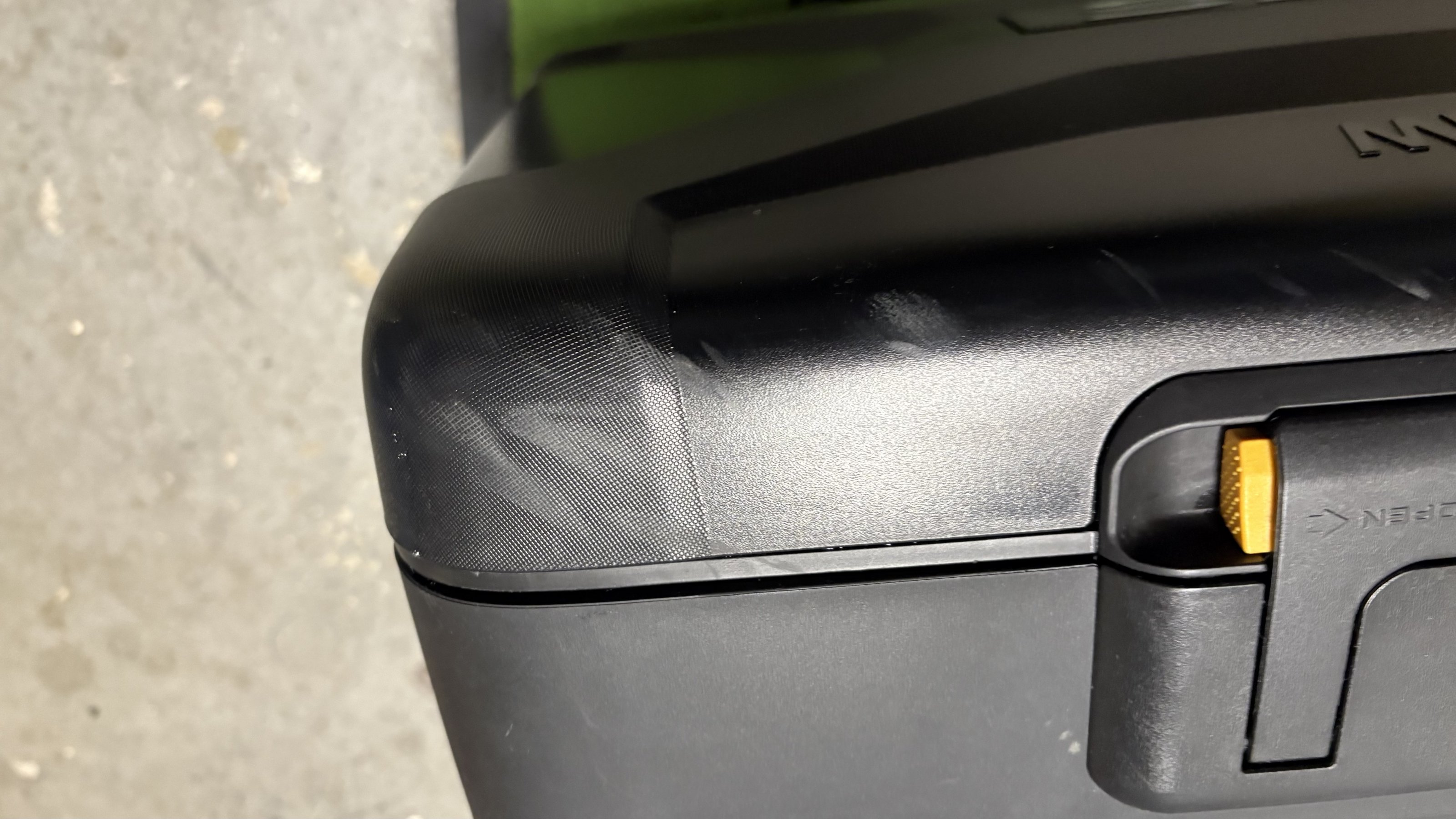 und die üblichen Spuren von Stiefeln, die nicht kontaktlos am Koffer vorbei rutschen, wenn das Bein nicht hoch genug kommt.