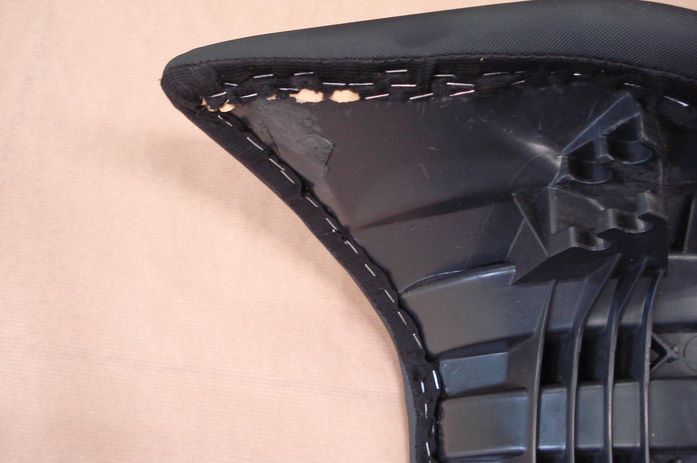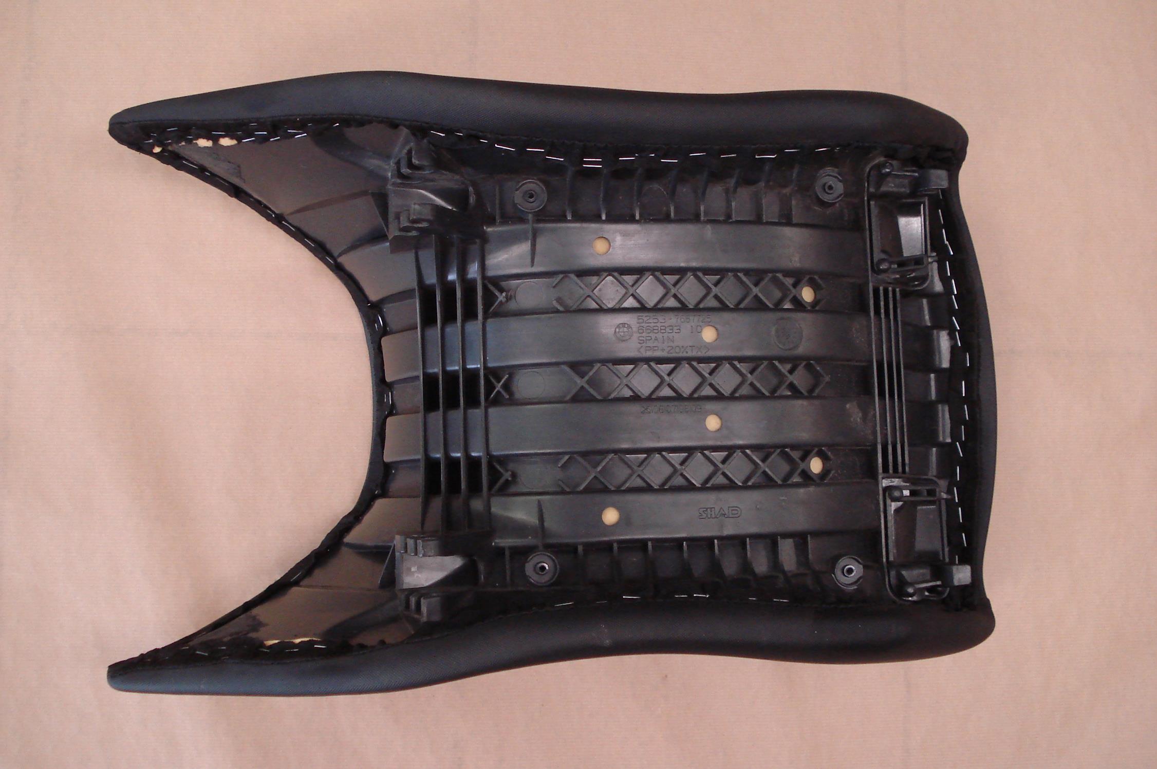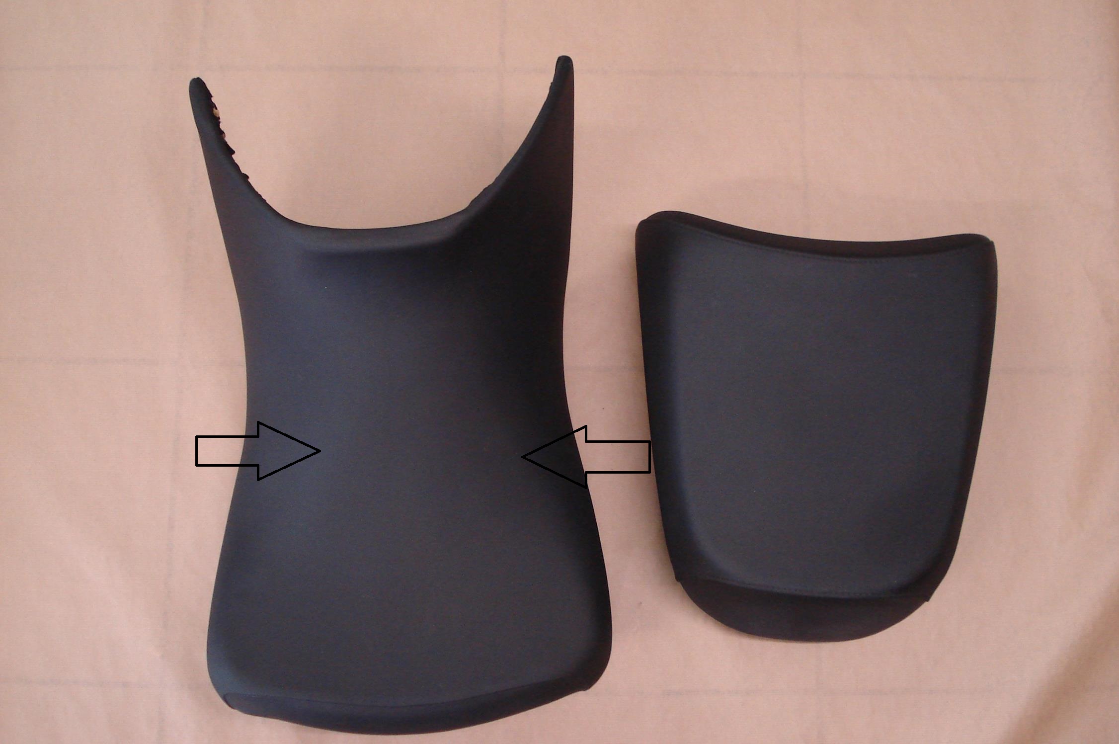 Der Soziussitz ist Original, den Fahrersitz habe ich ein bischen bearbeitet indem ich die Kante am Schaumstoff (siehe Fotos - Pfeile) abgerundet habe. Somit hat man diese Kante beim sitzen nicht mehr so gut gespührt. Weiters habe ich die vorderen Haltebügel entfernt, da ich die Bank eine Zeitlang vorne zusätzlich hoch gestellt hatte.