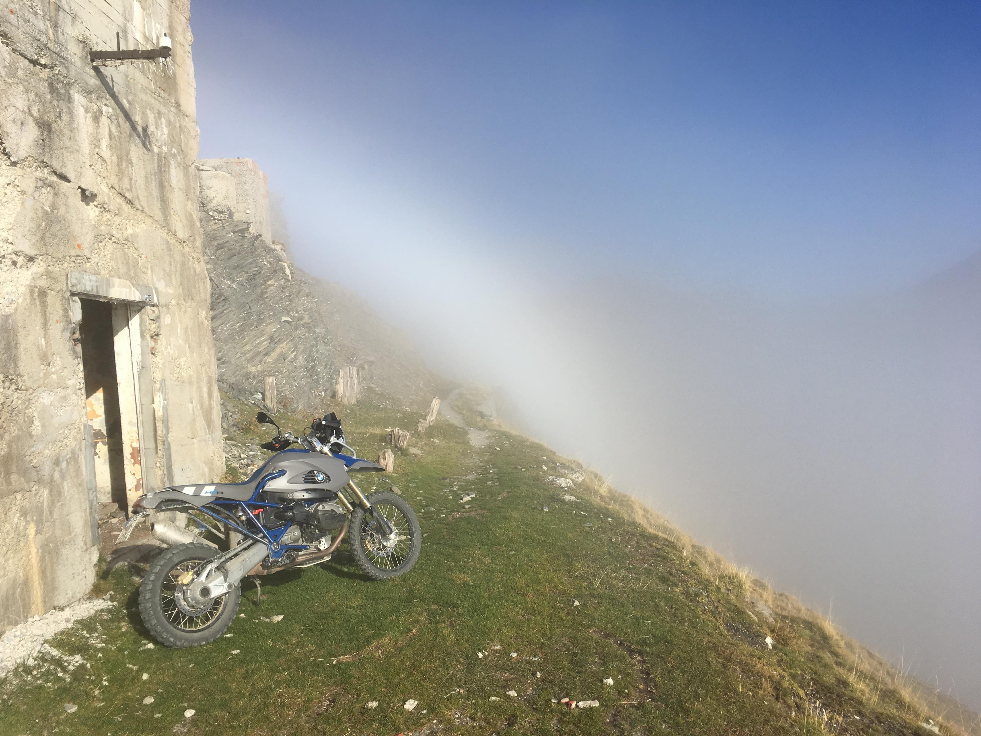 Benni und ich ließen uns den Gipfelsturm nicht nehmen. Gott sei Dank! Denn der letzte Teil bis zum Fort an der Paßhöhe ist wirklich atemberaubend schön, teilweise extrem schmal und die Fallhöhe wäre beachtlich! Benni mußte mich von hinten per Bluetooth mehrfach ermahnen, etwas weiter links an der Kante zu fahren, weil meine Koffer, die ich dummerweise nicht demontiert hatte, rechts am Felsen zu streifen drohten. Mit vermtl. nicht ganz belangslosen Folgen...links von der Kante gings Hunderte von Metern abwärts...ohne Randsicherung, natürlich.