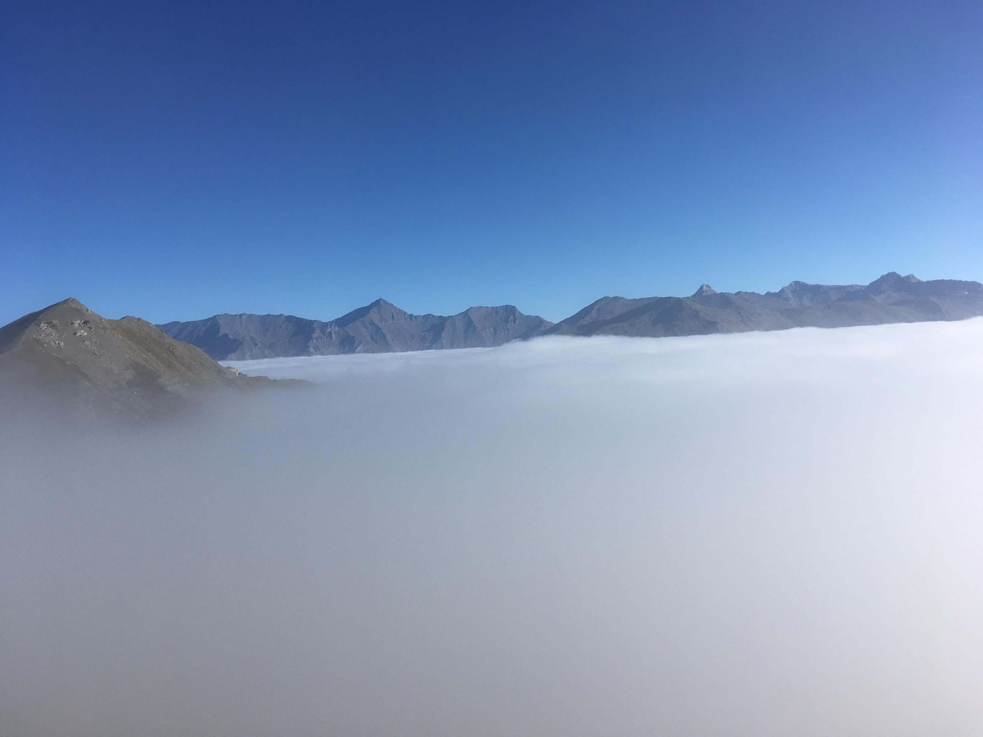 Die letzten Tage hier in Vallouise & den Seealpen waren unvergesslich schön, anders an diesem Morgen. Das Pelvoux-Gebirge ist nebelverhangen. Von der südlichen Seite her, luggte aber mittlerweile ab und an mal die Sonne durch. Das machte Hoffnung.