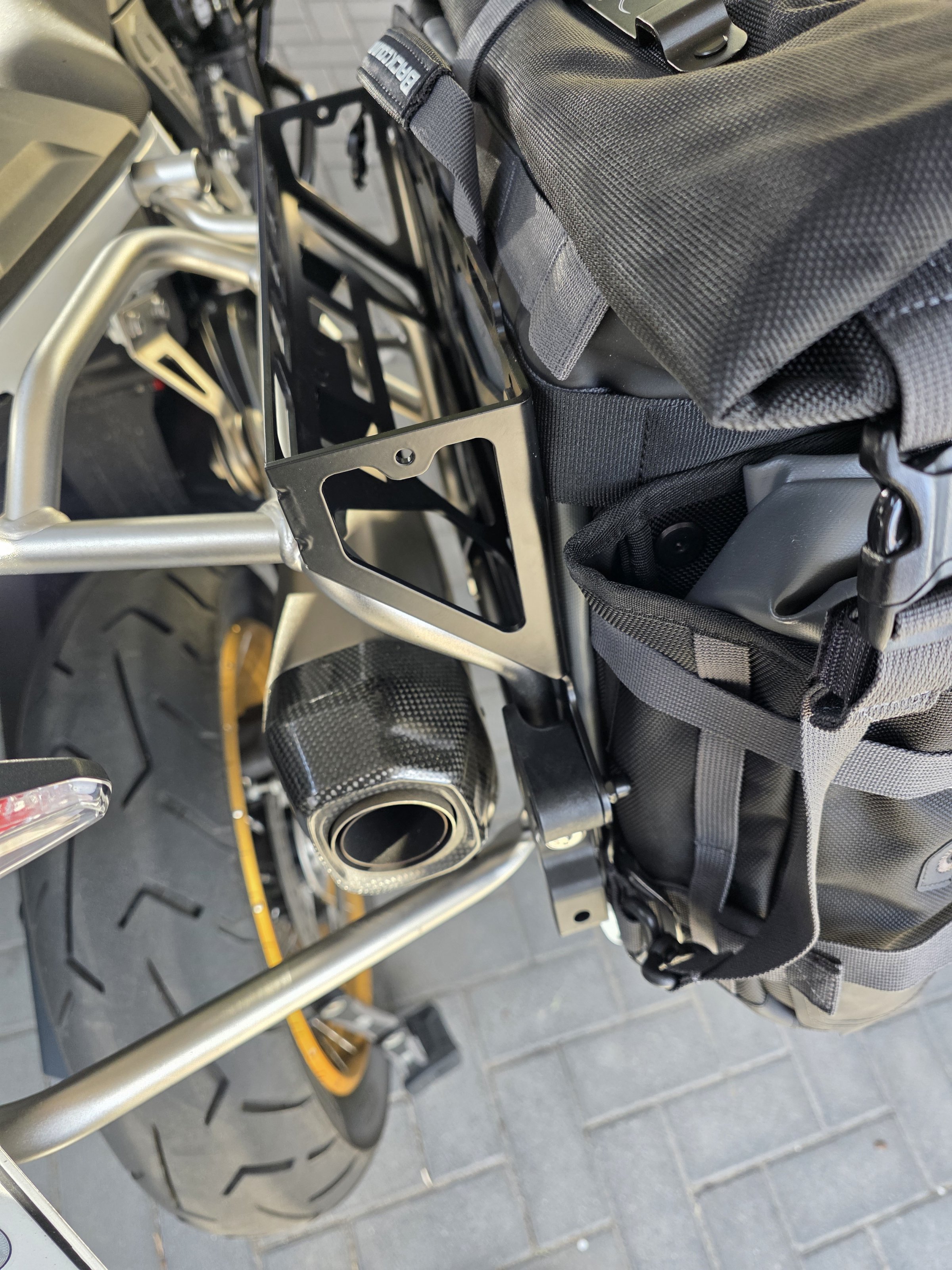 letzte Tage wollte ich meine neuen EuroMount Backcountry Pannier von Mosko Moto an den original BMW Kofferträger von meiner F 900 GS montieren. An der rechten Seite passte alles wie erwartet sehr gut. Nur links lässt sich die Packtasche nicht sicher montieren. Wenn ich die Tasche, wie es soll zweit nach hinten schiebe, dass er fest sitzt, ist zwischen dem Rahmenrohr und der Verriegelung des "EuroMount" ein gut 8mm großer Luftspalt.