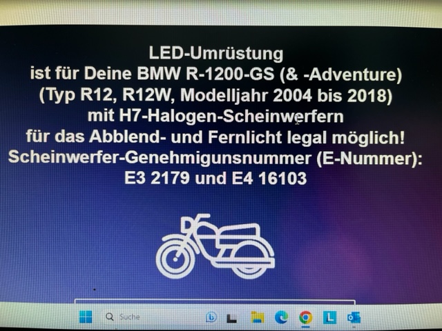 Der Einbau klappte hervorragend . Beim Registrieren und Abrufen der allg. Bauteile-Genehmigung stellte ich fest, dass der Beleuchtungskörper bei meiner GS gar nicht in den Abblendlichtscheinwerfer eingebaut, sondern lediglich die Fernlicht-H7 ersetzen darf. Meine GS hat im Glas das E Zeichen: E3 2179 ; also aufpassen bei der Bestellung und vorher den Scheinwerfer genau anhand der E Nr. überprüfen. Es muss noch andere in den Modelljahren 2004-2018 geben : E4 16103 da können beide H7 raus und die Philips LED verbaut werden. In der Werbung stehts anders. Ein Youtube Video zeigt auch den Austausch der Abblendlicht H7 . Ich frage mich nun, ob da bauliche Unterschiede sind und bitte hier mal darum, mir ein Foto einer luftgekühlten GS mit einem E4 16103 Scheinwerfer (EZ.: 2004 - 2011 ) zuzumailen. Ich kann mir nur vorstellen, dass die Streuscheiben unterschiedlich sind.