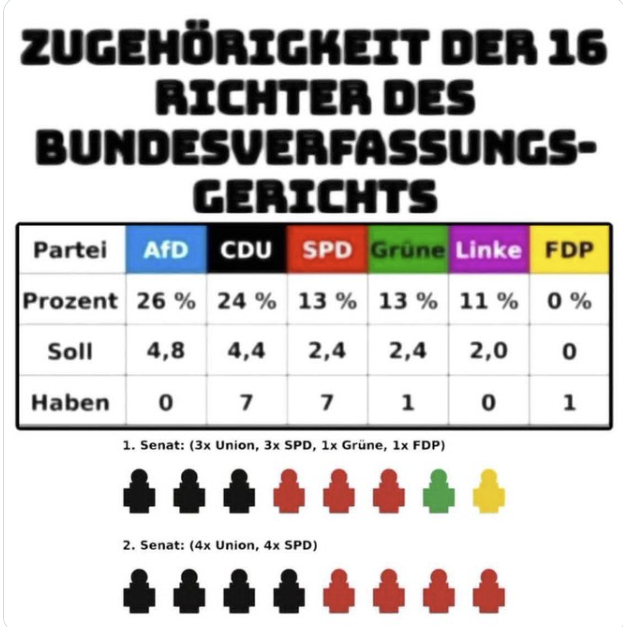 3 mit CDU Parteibuch, 3 mit SPD Parteibuch und die anderen beiden, weiß ich nicht. Kannst Googeln, wer s genau wissen will. Von der AFD wird nie einer angenommen... Ja, da wundert sich jemand über die Urteile.