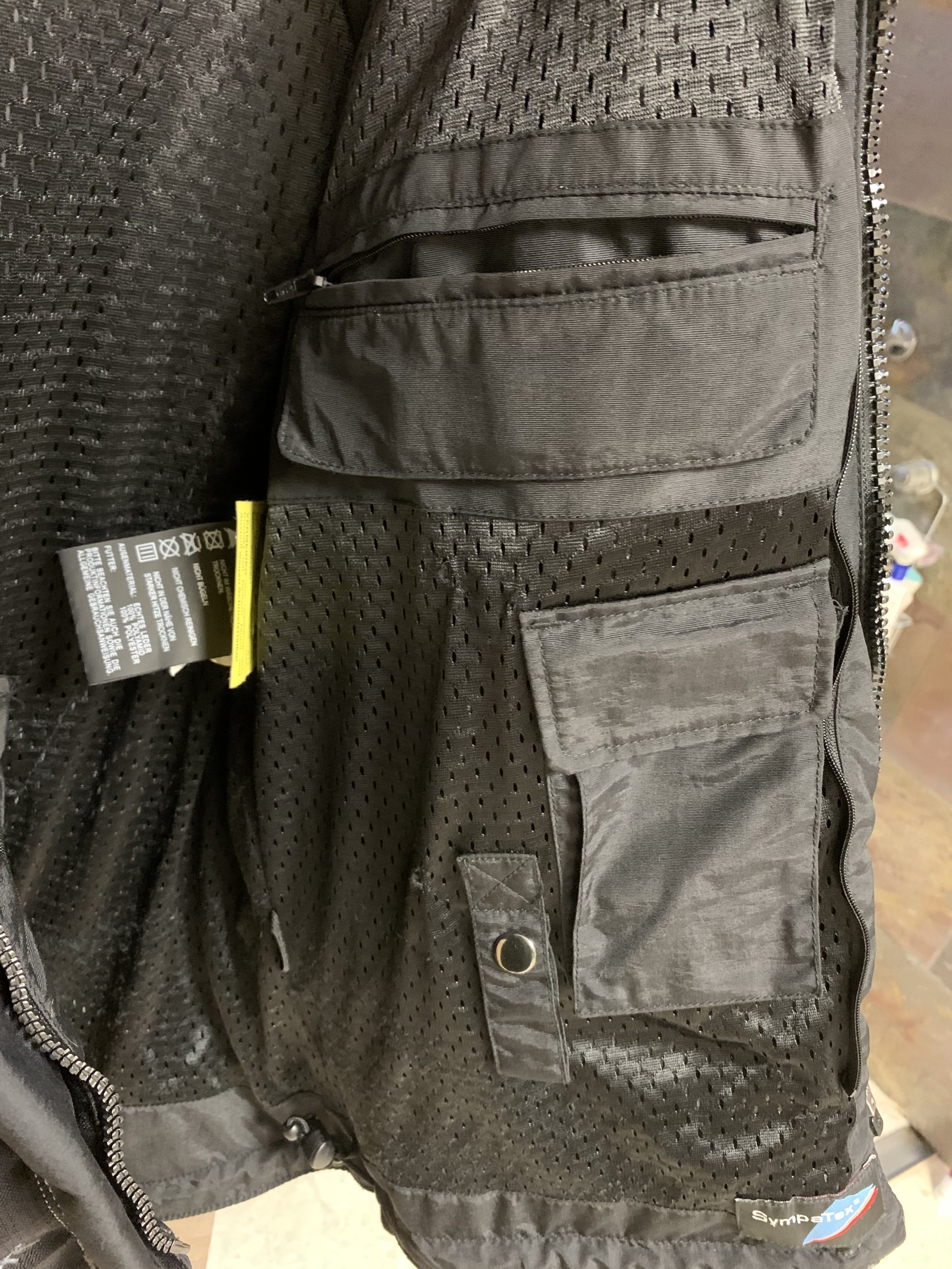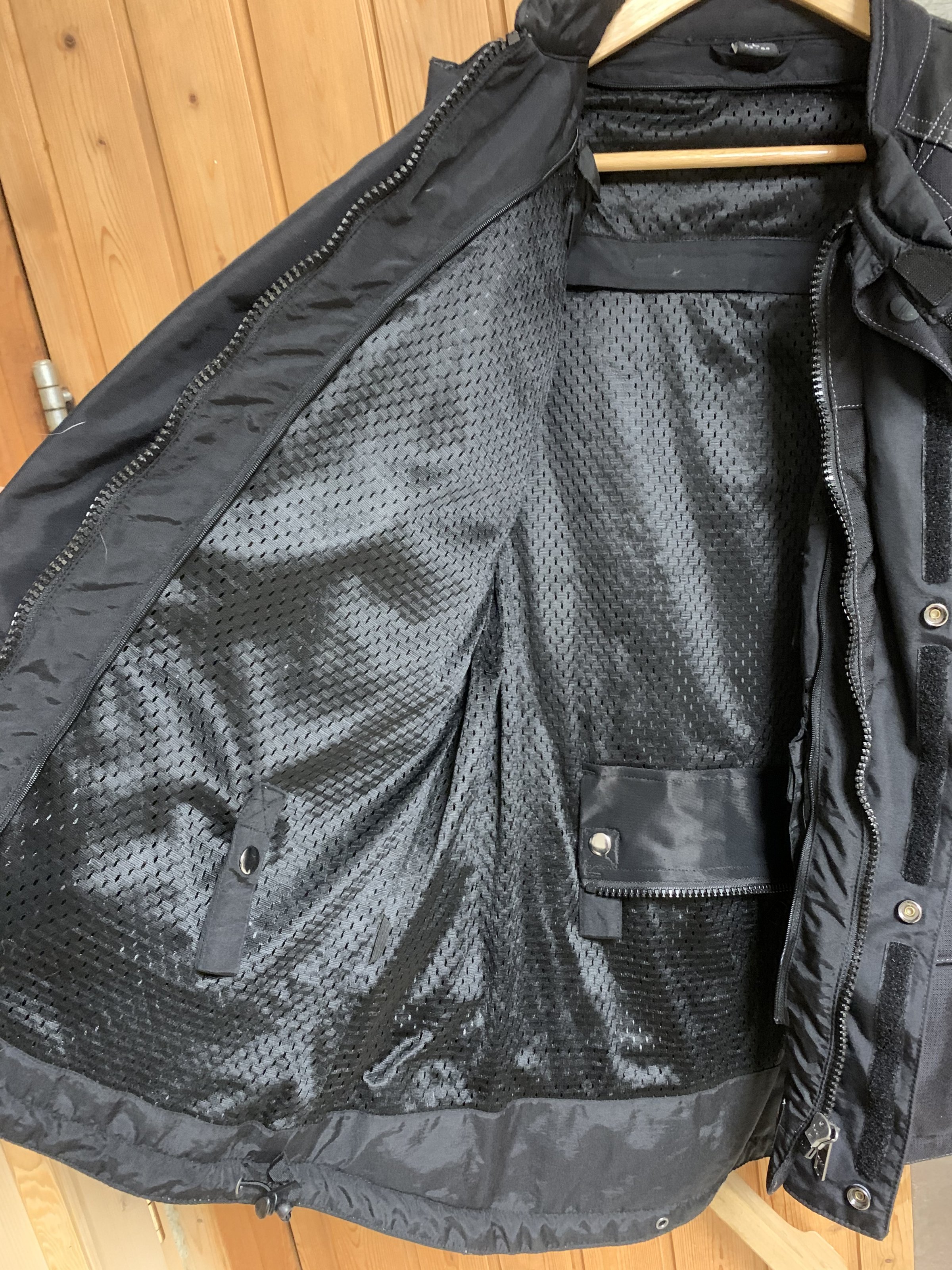 Es ist eine schwarze Textiljacke mit Wildlederbesatz an den sturzgefährdenden Stellen. Sie verfügt über eine wattierte Innenjacke, welche herausnehmbar ist.