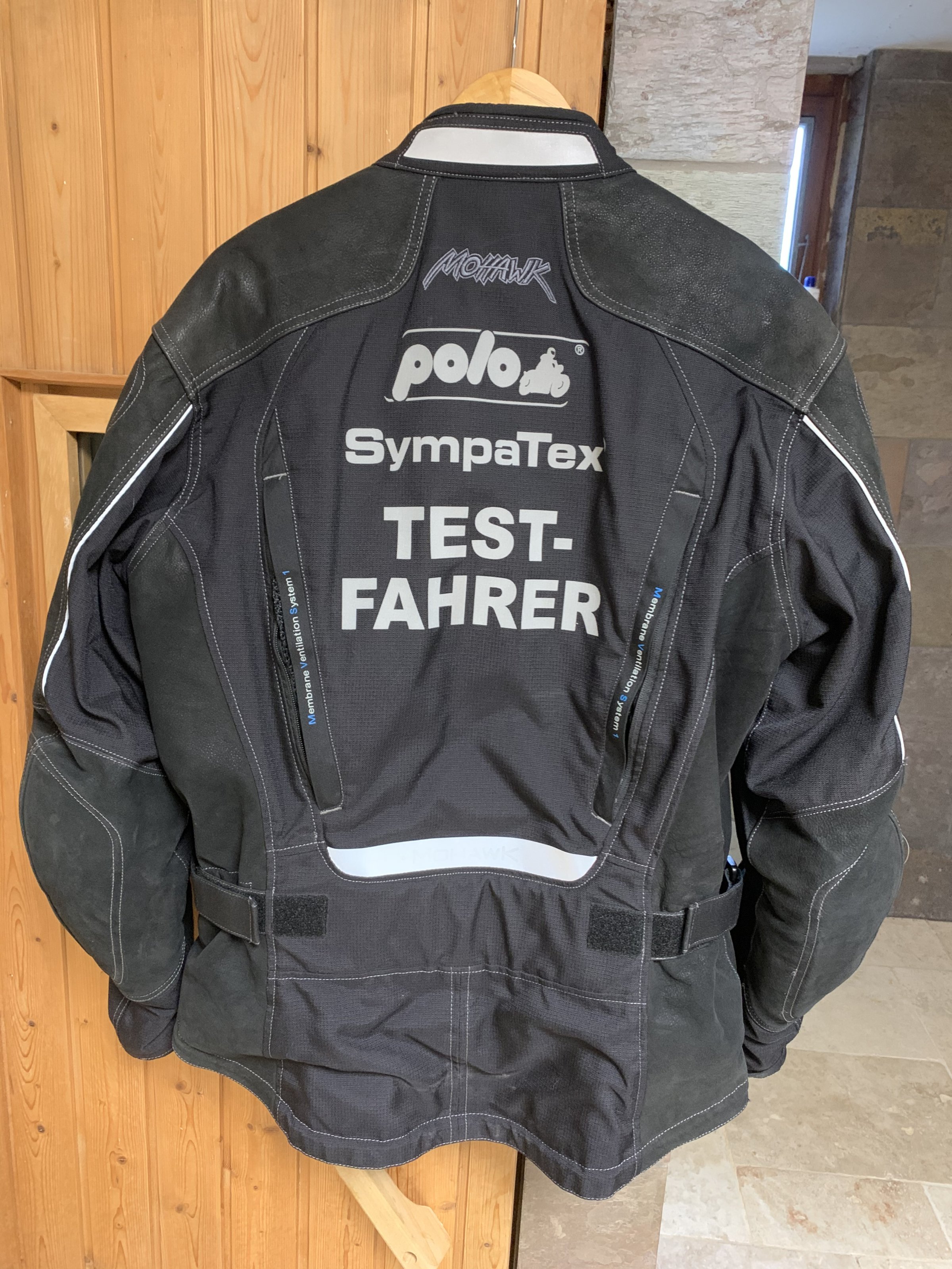Die Jacke hat den reflektierenden Aufdruck „Testfahrer“ auf dem Rücken. MVS-1 Membran-Ventilations-System, die Knöpfe sind mit Gummi überzogen um Kratzer am Lack zu vermeiden.