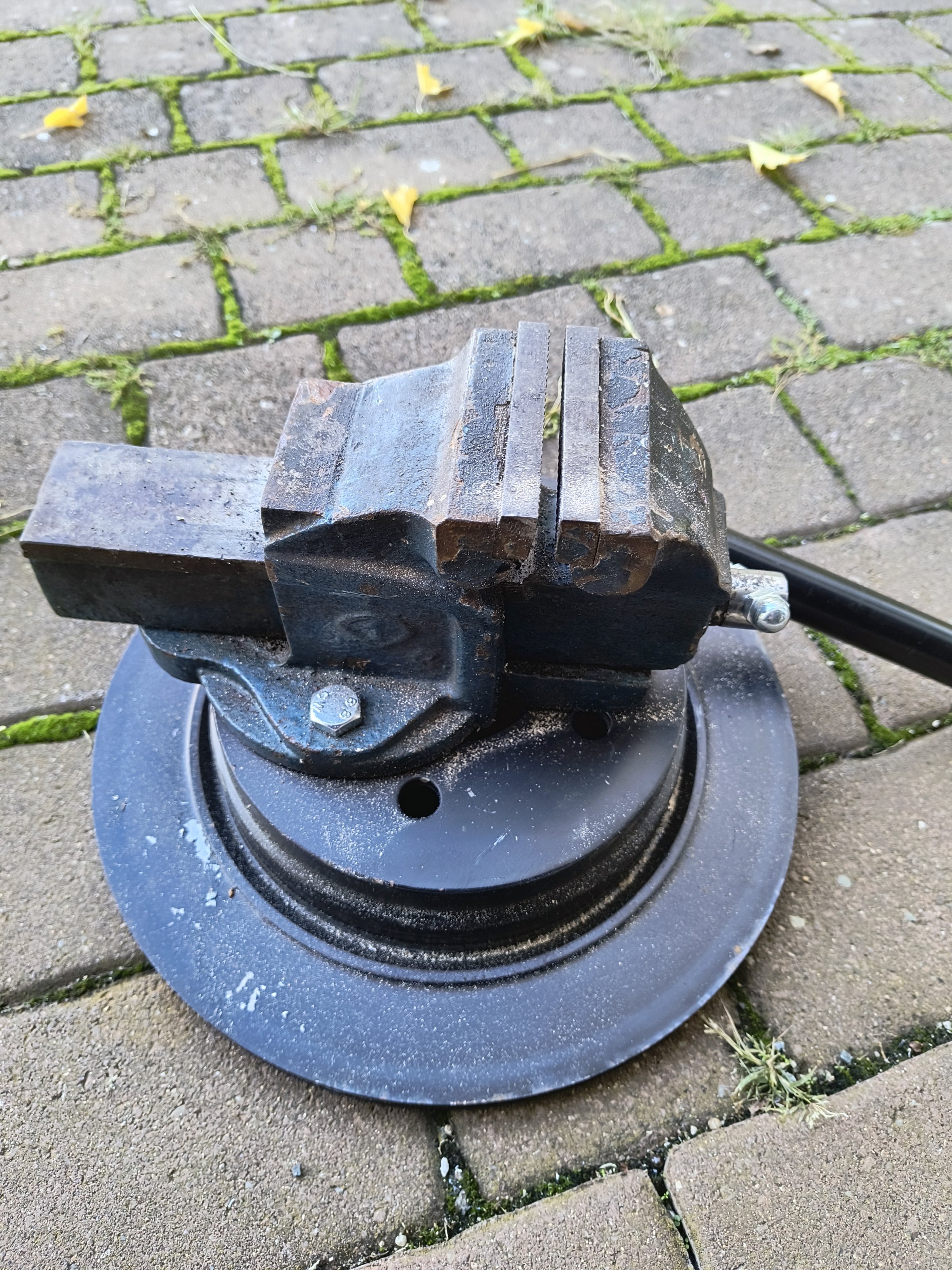 Ich fange mit meinem transportablen Schraubstock den ich auf eine alte Bremsscheibe geschraubt habe an.