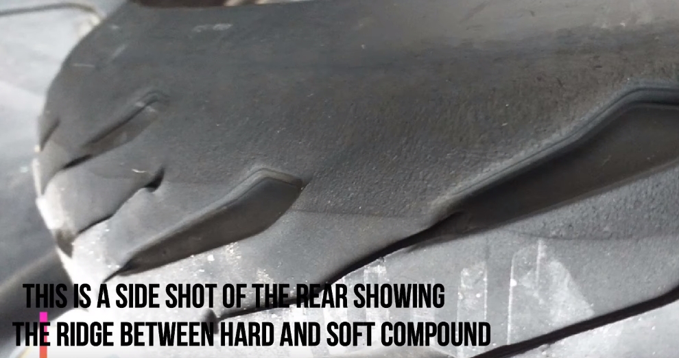 So ist es. Offensichtlich weiß dieser Mann gar nicht, wie man ein Reifenbild deutet. Der Grat („ridge“) zwischen weicher und härterer Mischung ist zwar sichtbar, aber im Fahrbetrieb völlig unbedenklich, beim Einlenken in Kurven ist davon nichts (!) zu spüren.
