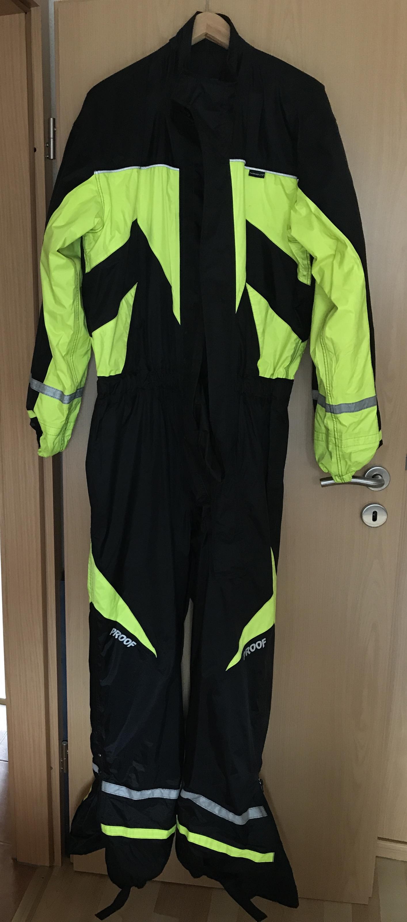 Der Regenkombi ist gebraucht aber in einem sehr guten Zustand. Absolut dicht und ohne Beschädigungen.