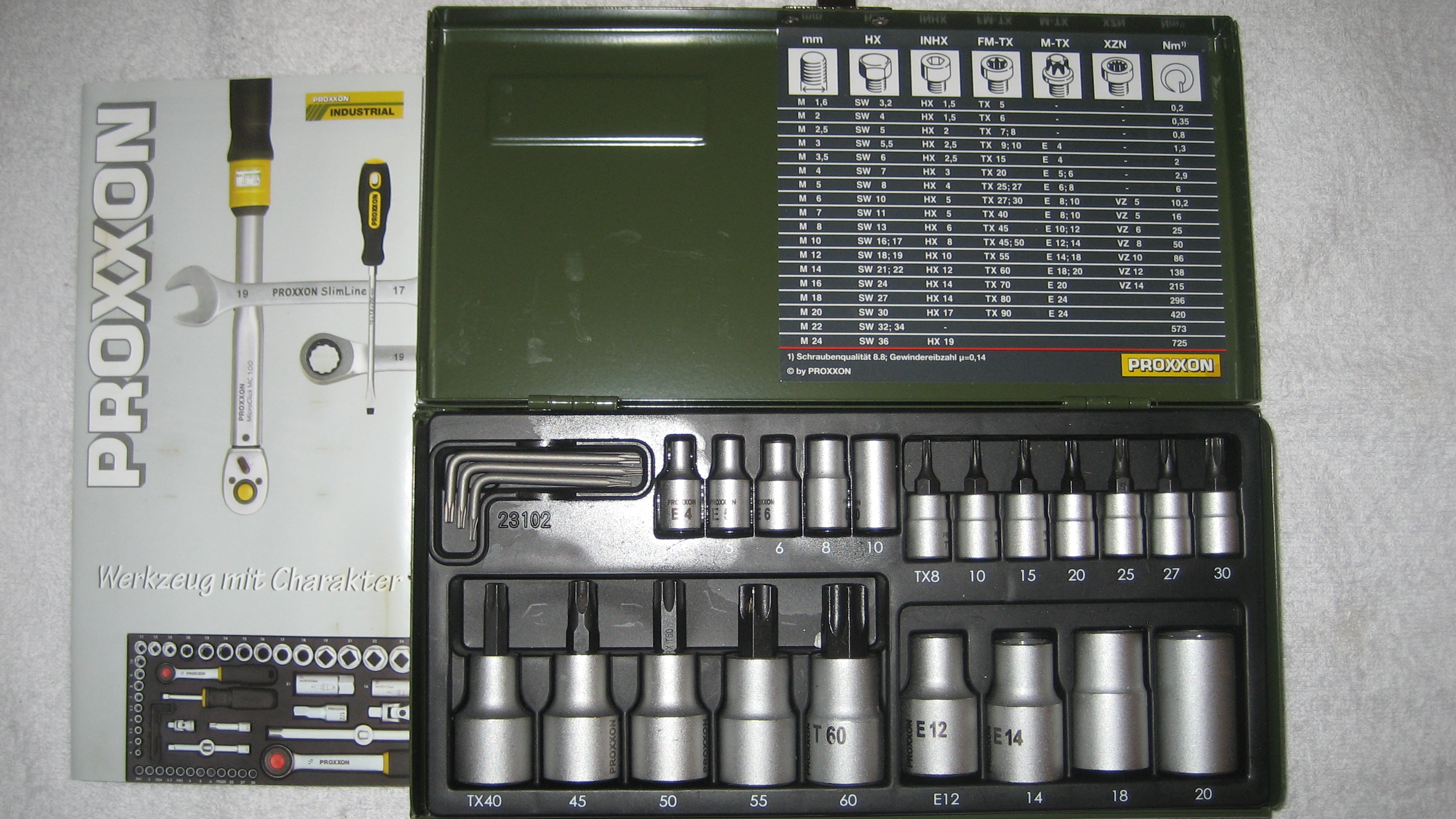 Für 1/2"-Antrieb (12,5 mm) Gr. TX 40 - 60 und Außen-TX E 12 - E 20 (für Anzugsdrehmomente von 25 - 135 Nm). Drei abgewinkelte Schlüssel TX 6, 8 und 10.