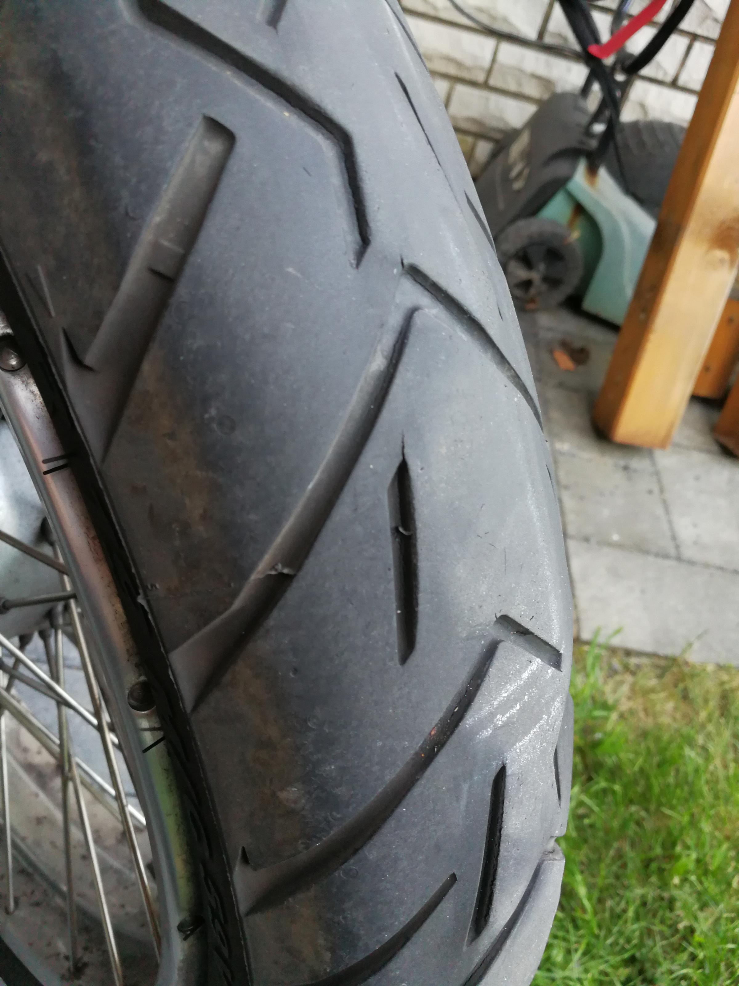 bei der gestrigen Tour machte mich mein Kumpel auf das merkwürdige Profilbild meines Vorderreifen's aufmerksam. Laufleistung ca. 12tkm. Ich hoffe man kann es auf den Bildern erkennen, es gibt Höhenunterschiede im Profil. Im Fahrbetrieb aber keinerlei Probleme. Ich fahre hauptsächlich zur Arbeit mit dem Mopped, d.h. viel geradeaus.