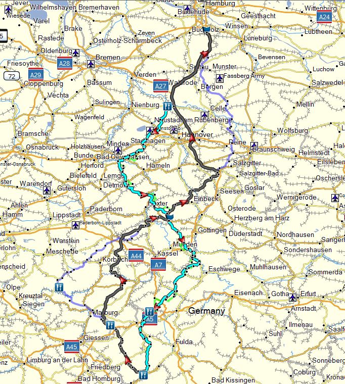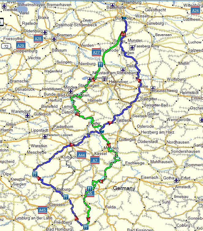 Bis Höhe Hannover: streiche "schön kurvig", setze "langgezogen kurvig / überland". Oder so... Jedenfalls irgendwie Landstraße, ggf. kleinere Zubringer. Danach gehts wohl.