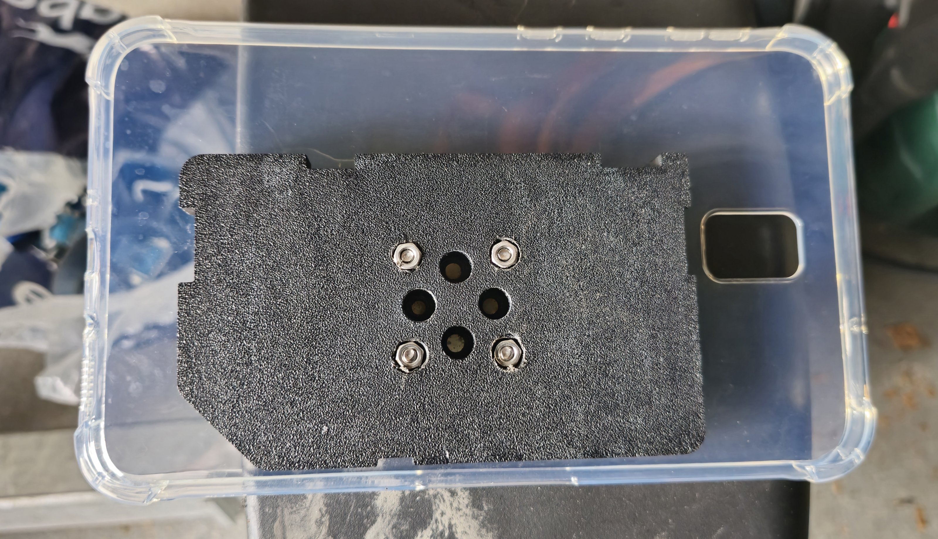 Ich hab kurzerhand Kalles Adapterplatte genommen, auf die Tablethülle gelegt, die Löcher markiert und gebohrt. Dann einfach die weiche Hülle auf die Platte geschraubt. Weil diese eben weicher ist, als die originale Hülle, ziehen sich die Schrauben auch tiefer rein und drücken dann nicht auf die Rückseite des Tablets. Zur Sicherheit etwas Tape auf die Schrauben und fertig war die Sache.