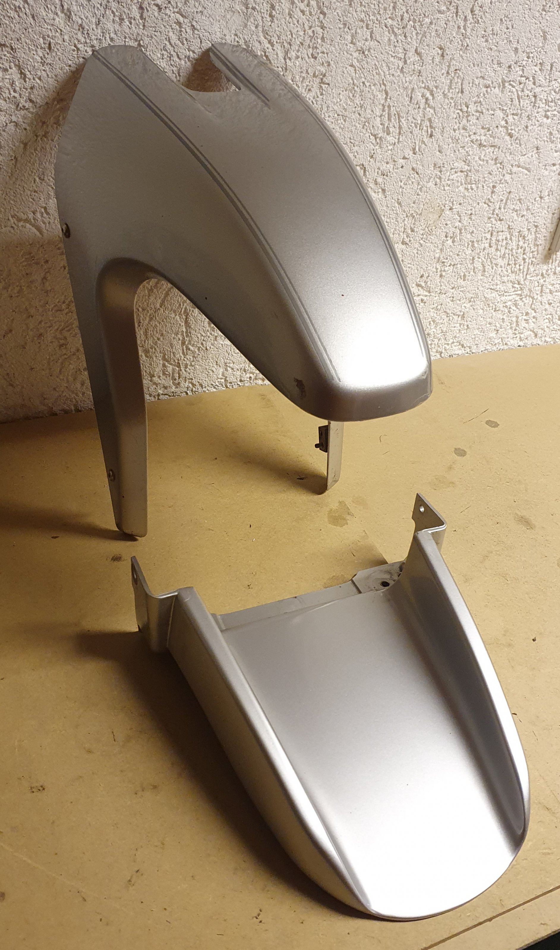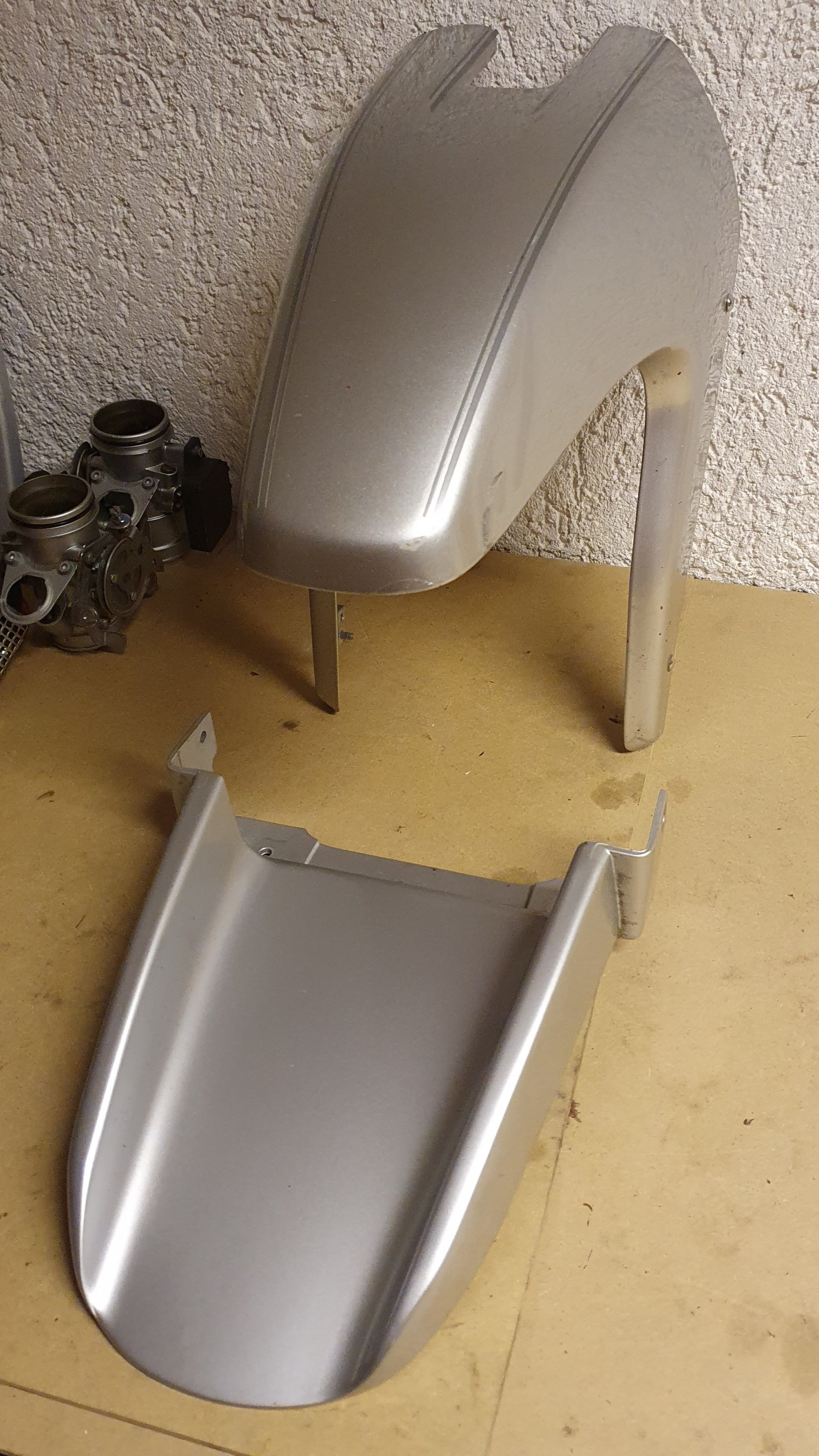 Ich habe noch einen gekürzten oberen Kotflügel, sowie einen unteren Kotflügel, wie er von Zweckdesign für den schnabellosen Umbau angeboten wurde. Die Montageteile für den unteren Kotflügel sind mit dabei.