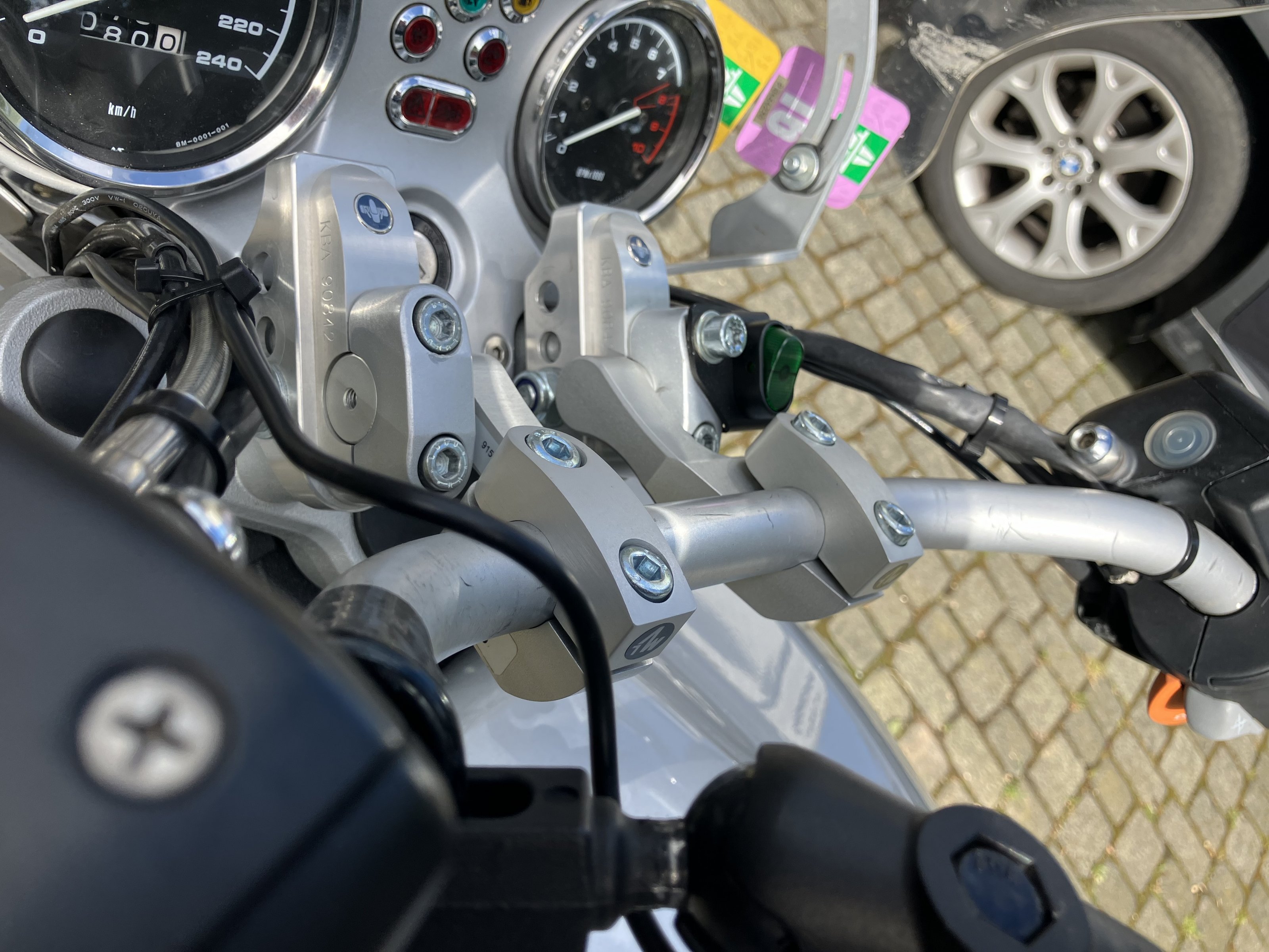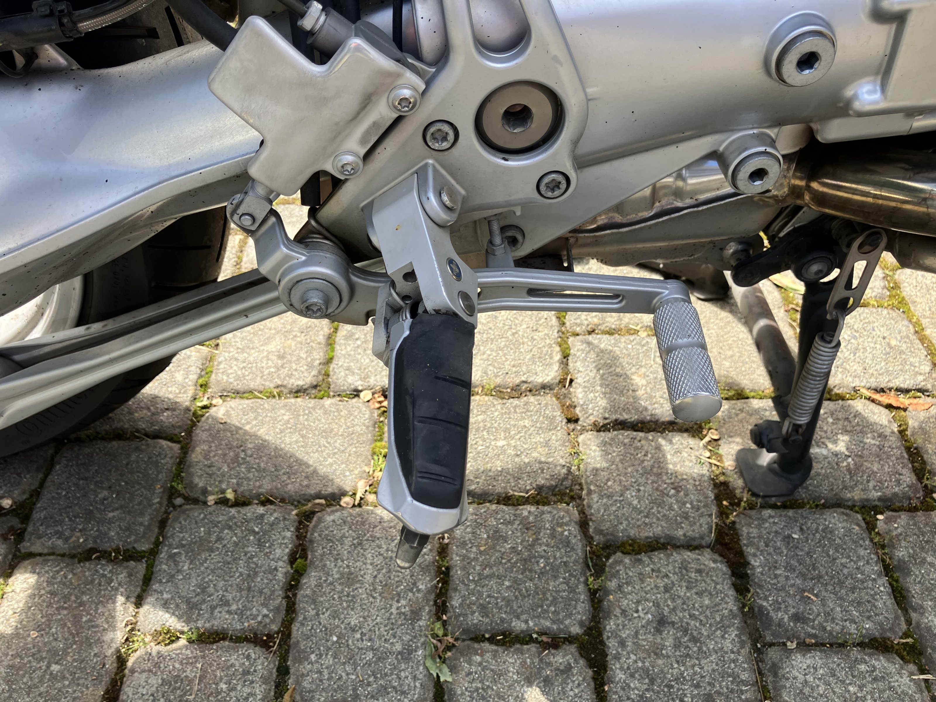 Umbauten: Hohe Scheibe von Wunderlich, Nebelleuchten, Fußrasten tiefergelegt, Lenker höher und näher zum Fahrer verlegt, BORBRO-Fahrersitz (niedriger, gut geeignet für nicht so große Personen) 500 km alt, Topcase, dessen Halterung ein Eigenbau aus Edelstahl ist, der am originalen Gepäckträger verschraubt ist und leicht (4 Schrauben) wieder gegen die originale Brücke getauscht werden kann. Verstellbare Navihalterung für Garmin Zumo 390.