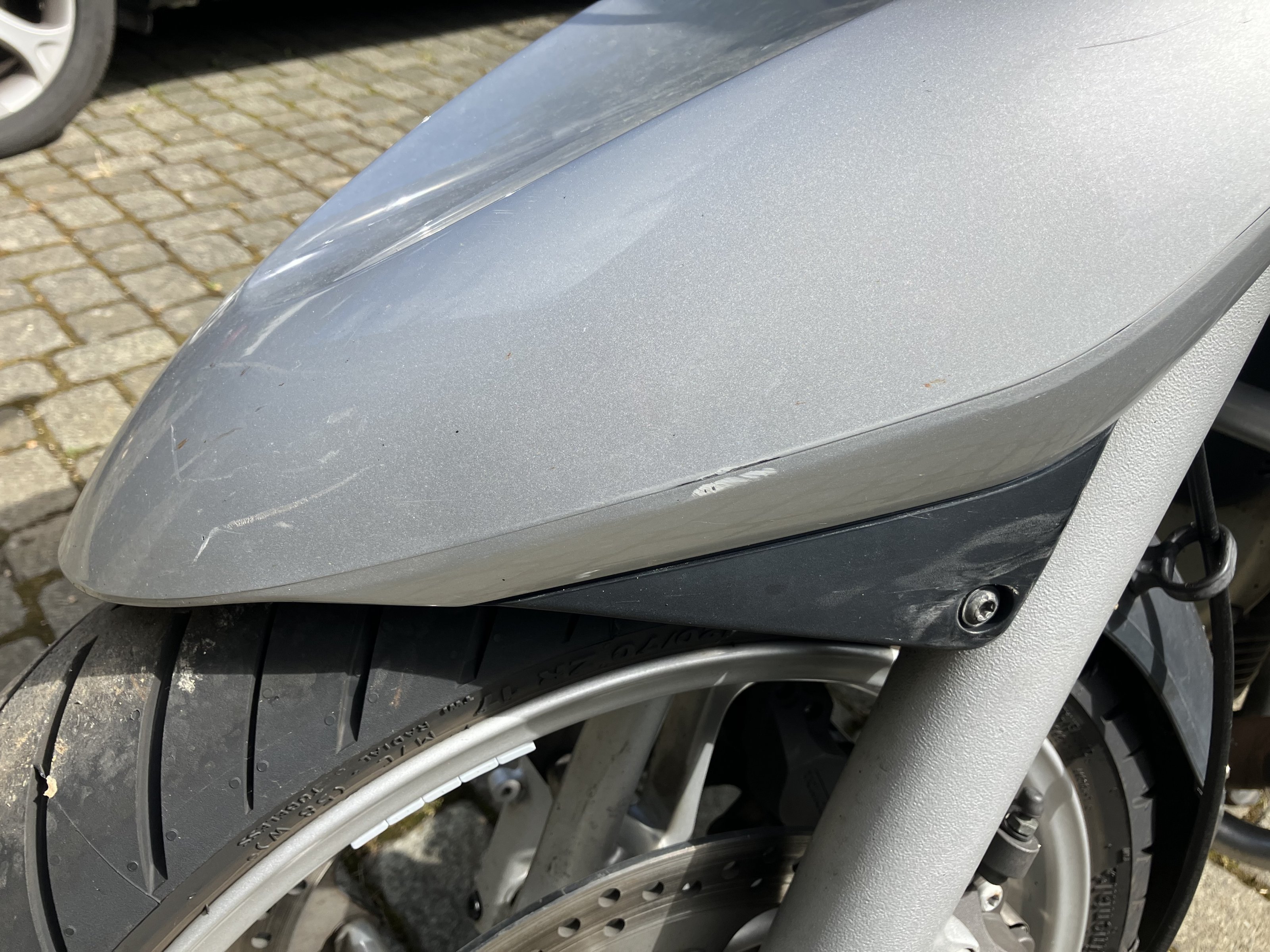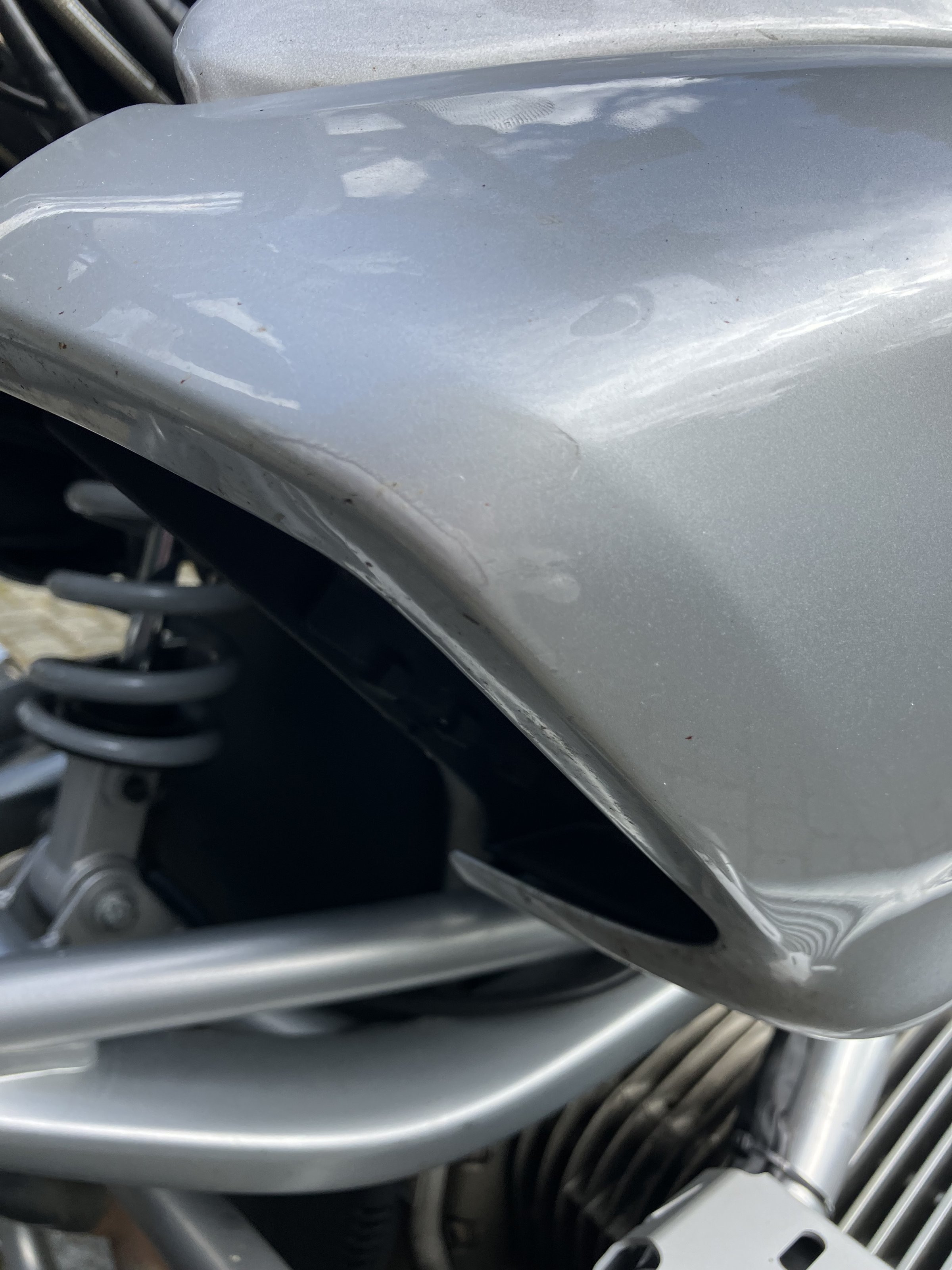 Die auf zwei Fotos erkennbaren Lackmacken am vorderen Kotflügel und an der linken Ölkühlerverkleidung stammen von einem Umfaller im Stand. Die Lackmacken an der ÖK-Verkleidung können m.E. wahrscheinlich durch Überpolieren beseitigt werden.