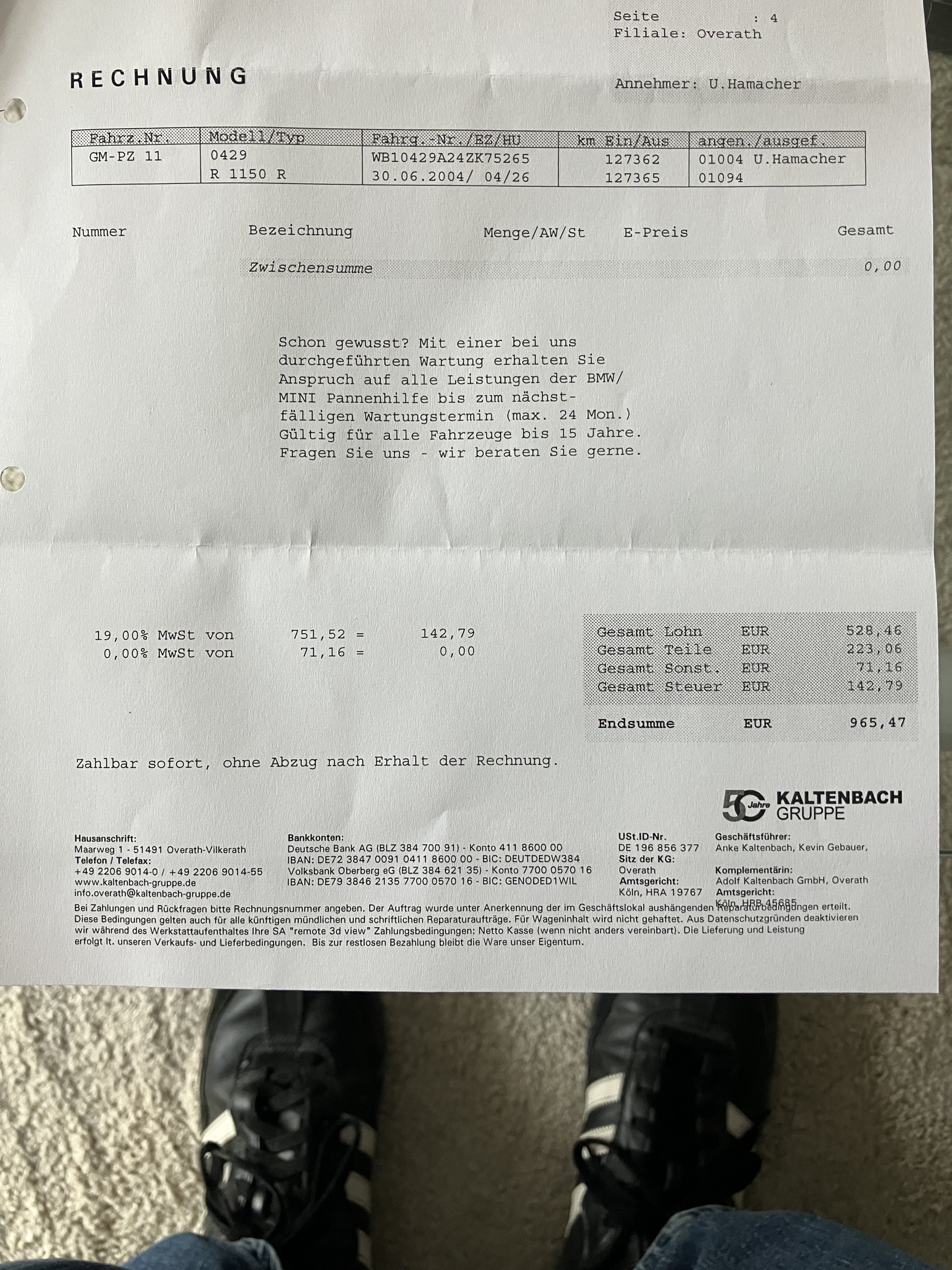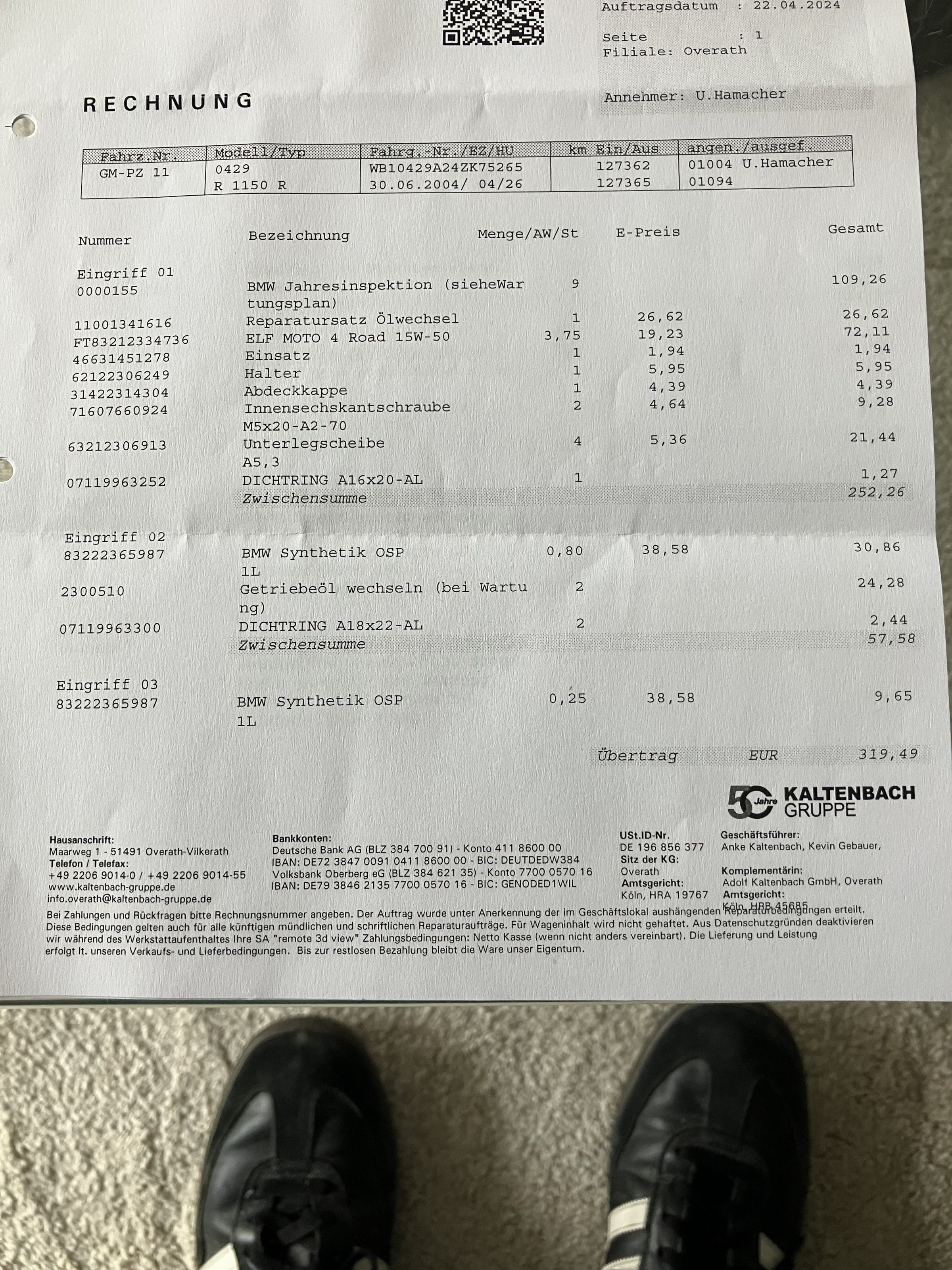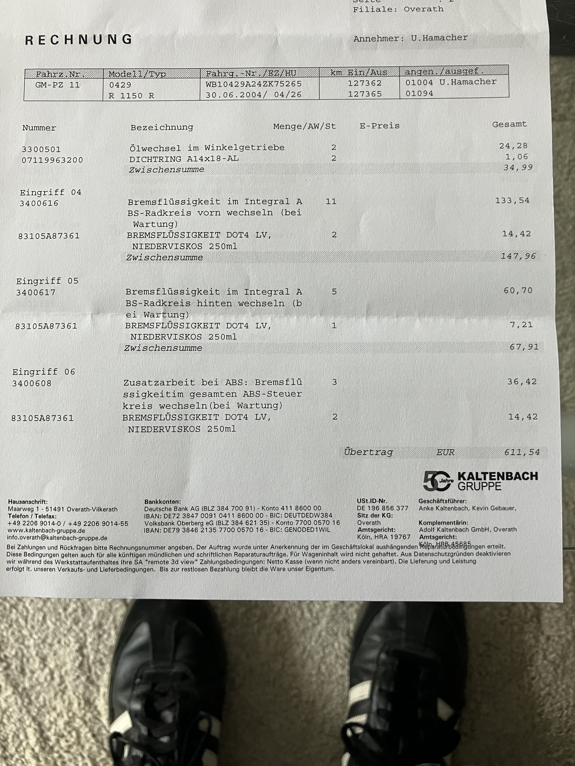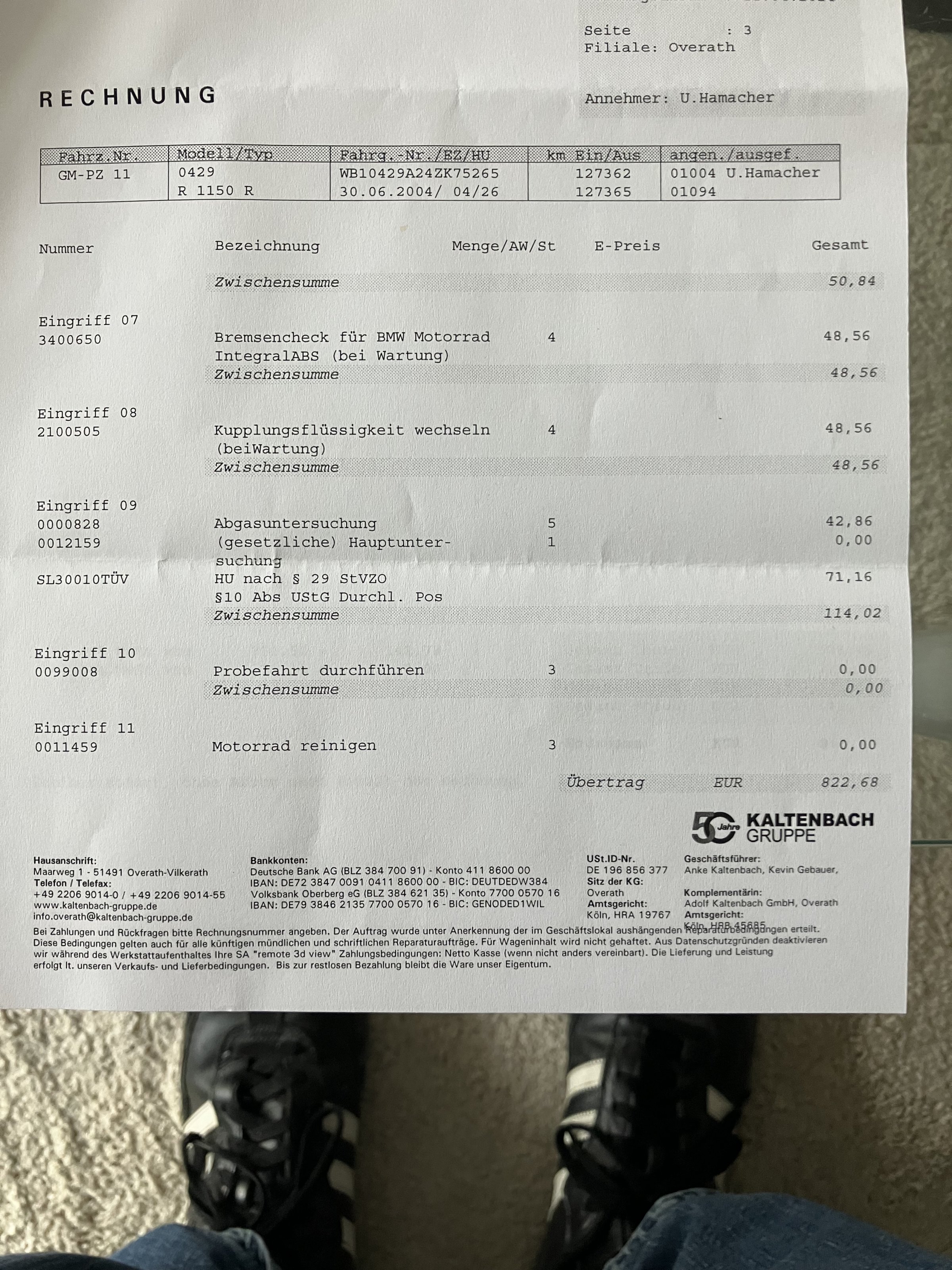Hier die Bilder vom ungeputzten Motorrad und der Rechnung vom letzten Service:
