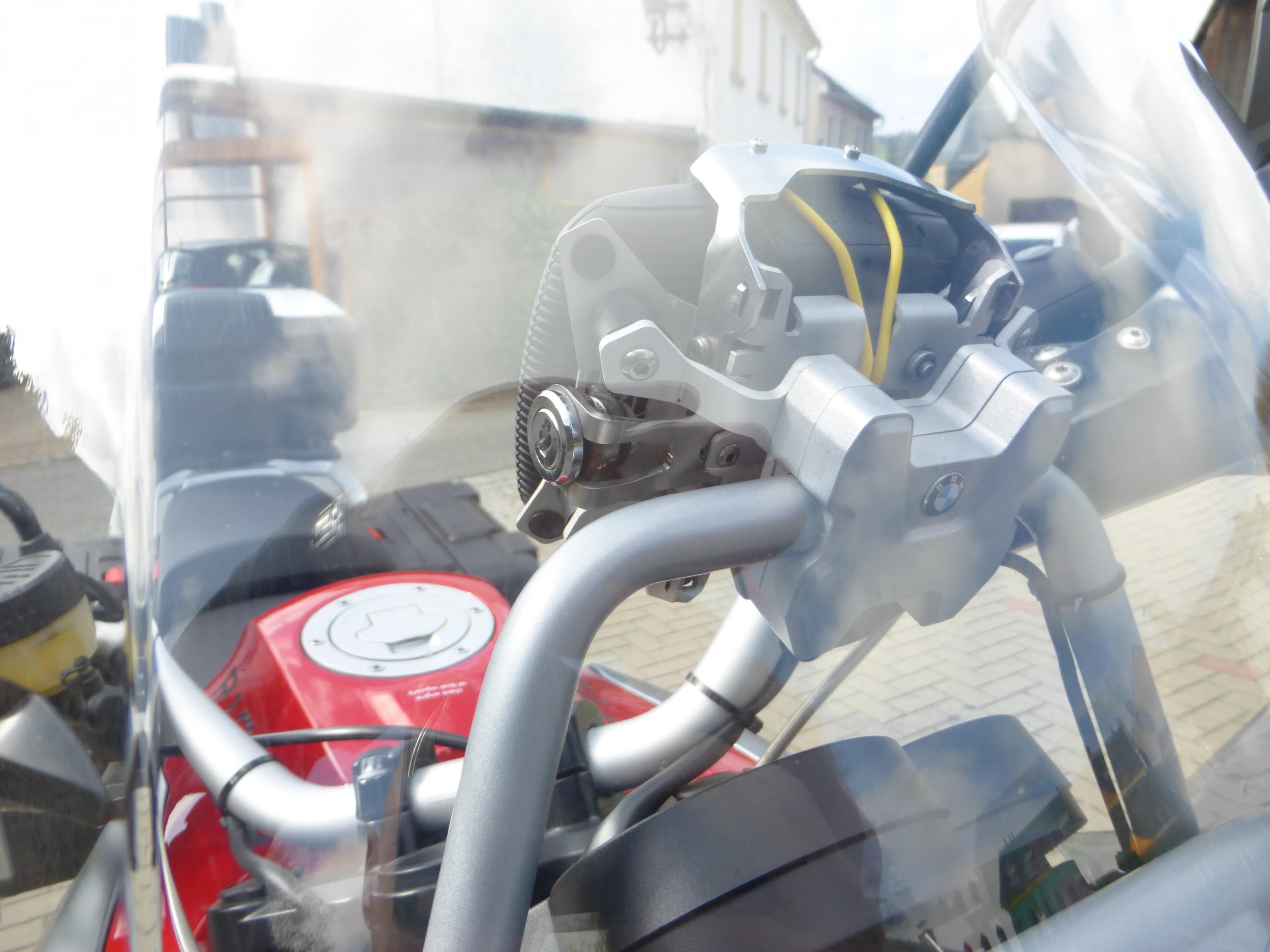 Verbaut ist ein Navibügel von BMW, mit einer Touratech Navihalterung (Schwingungsentkoppelt und abschließbar) und einem gefrästen Halter aus Alu, Glasperlengestrahlt mit BMW Emblem (einmalig auf der Welt und fast zu schade dran zu lassen).