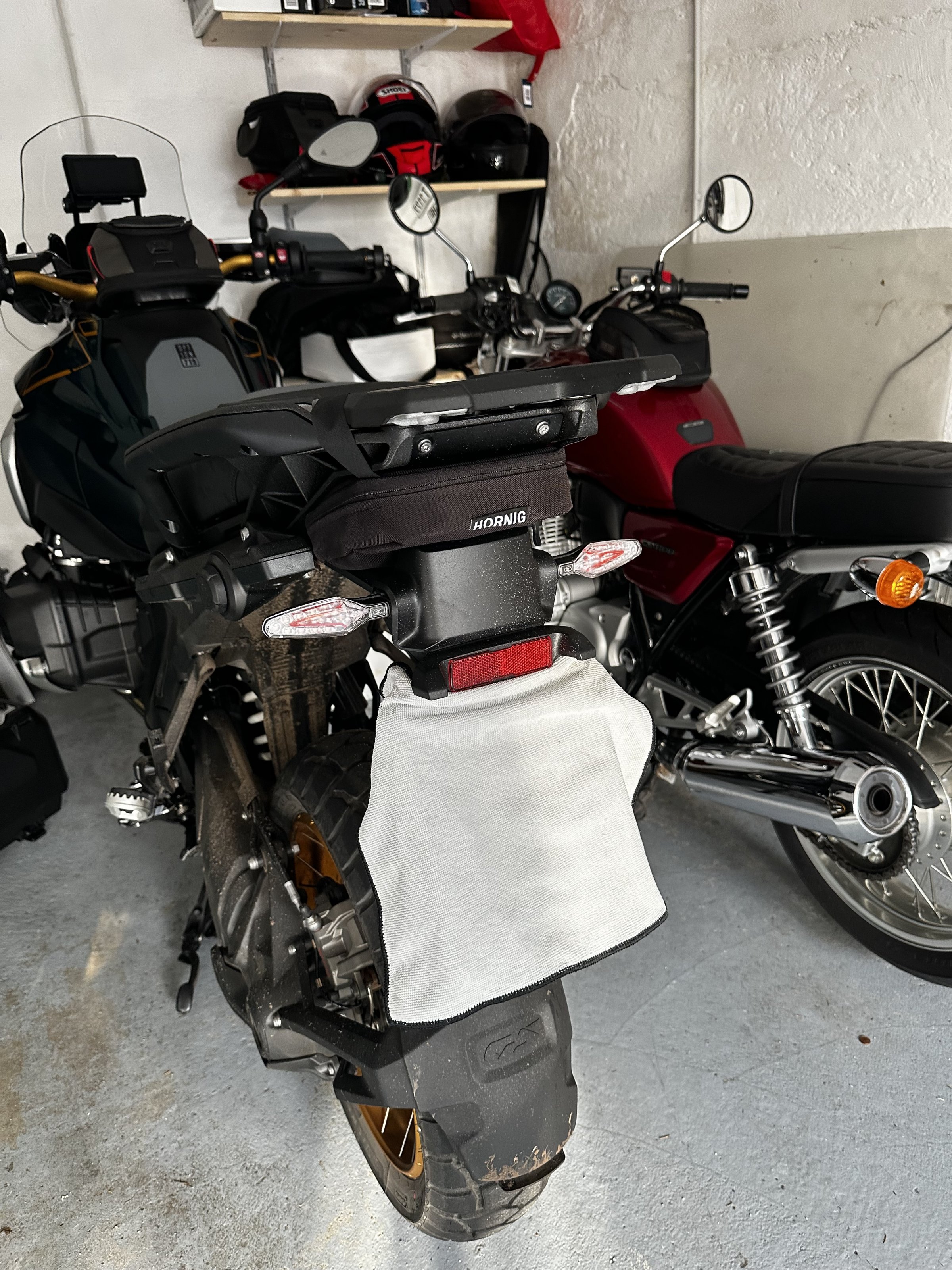 Das gute Mikrofasertuch von S100?Ich habe die Tasche unter dem Tapcaseträger von Hornig. Die kann auch bei Montage des Topcase dran bleiben. Innern Warnweste und Medipack. Da die Tasche nicht dicht ist habe ich beides vacuumiert, in den üblichen Beuteln für die Küche.