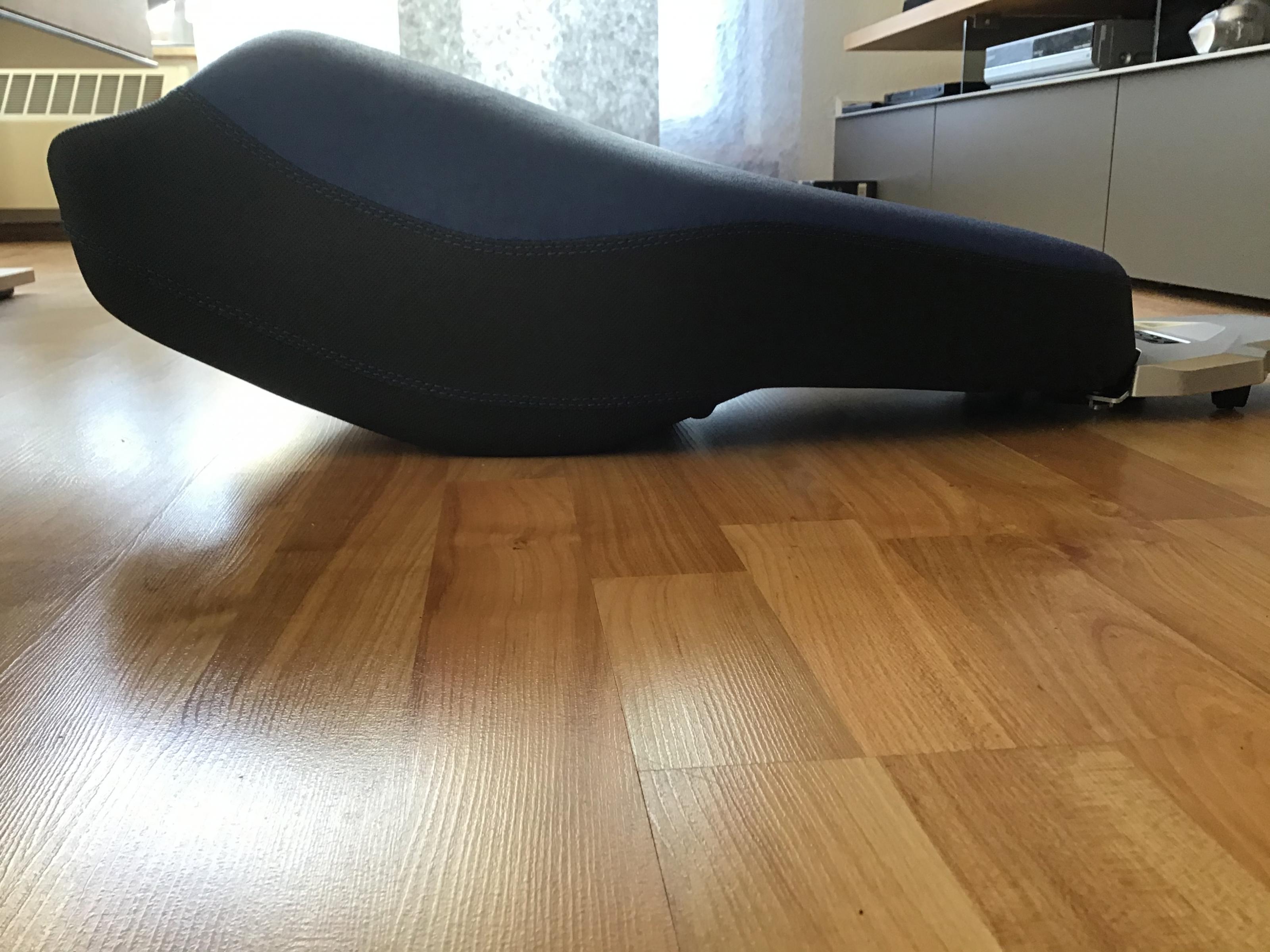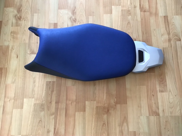 Die Bank ist aufgepolstert und mit blauem und schwarzem Stoff bezogen; passend zur Rallye bzw. entsprechenden Adventure. Die Bank ist superkomfortabel und bequem, allerdings steigt die Sitzhöhe um 3-4 cm.