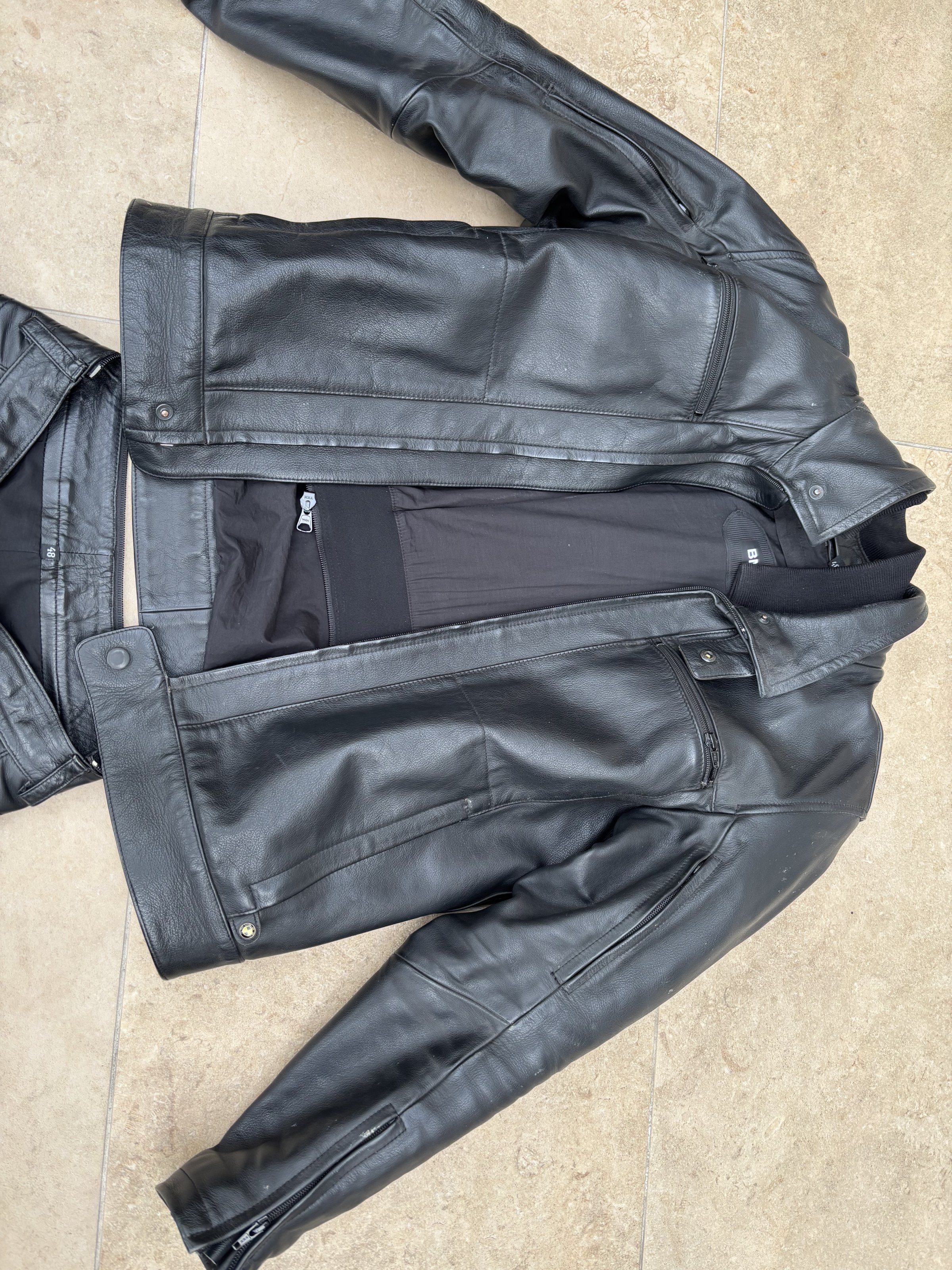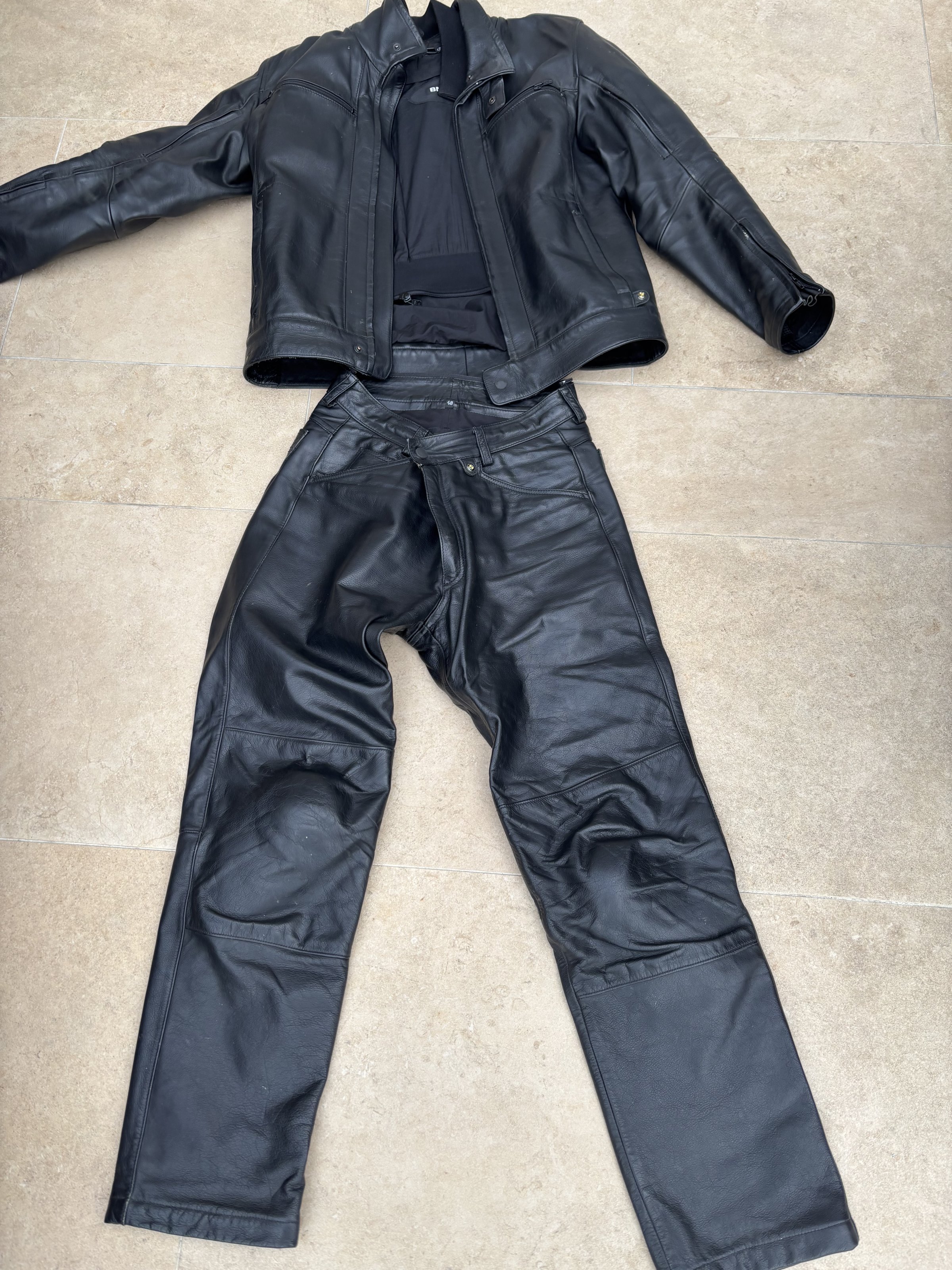 Leider hängt das Zeugs seit Jahren im Keller, da ich nur noch GS fahre und zum anderen passe ich über die Jahre nicht mehr rein. Die Jacke ist großzügig geschnitten, kann auch als Größe 50 durchgehen, die Hose ist, insbesondere beim Bund 48.