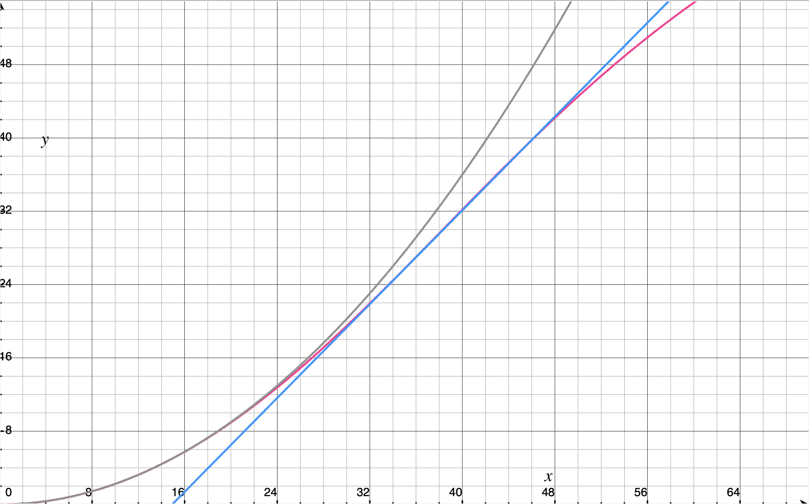 Im Bereich von null bis zehn Grad Schräglage wächst der Winkel (rote Kurve) zwar ungefähr quadratisch (graue Kurve) mit der Geschwindigkeit, danach aber lässt die Progression nach und ab ungefähr zwanzig bis gut vierzig Grad gibt es näherungsweise nur noch lineares Wachstum (blau).