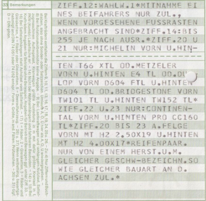 Bei mir steht gerade weder was von Reifenbindung gem. Betriebserlaubnis drin, noch irgendwelche Fabrikate...Im Brief Steht im Anmerkungsfeld garnichts.
