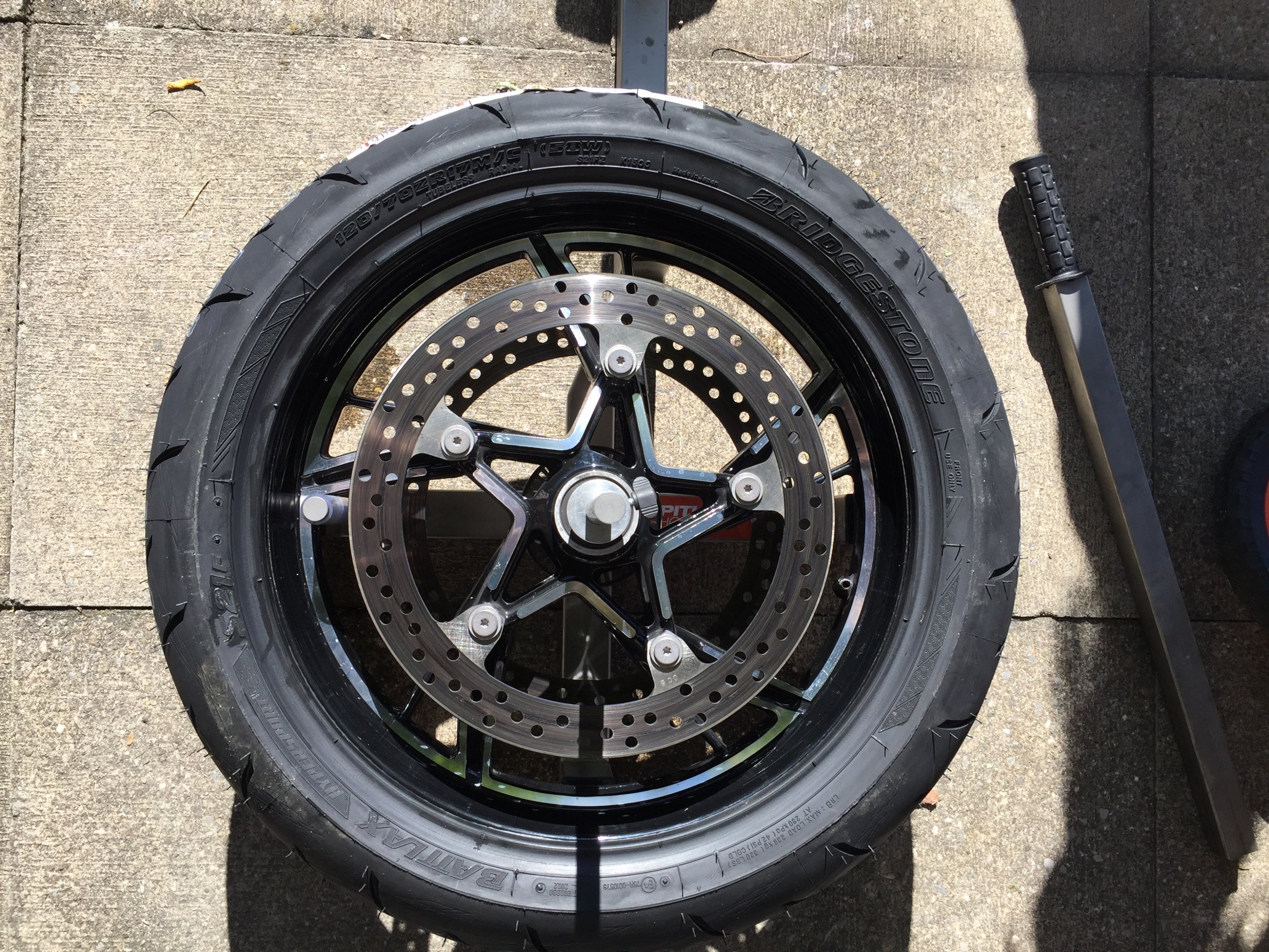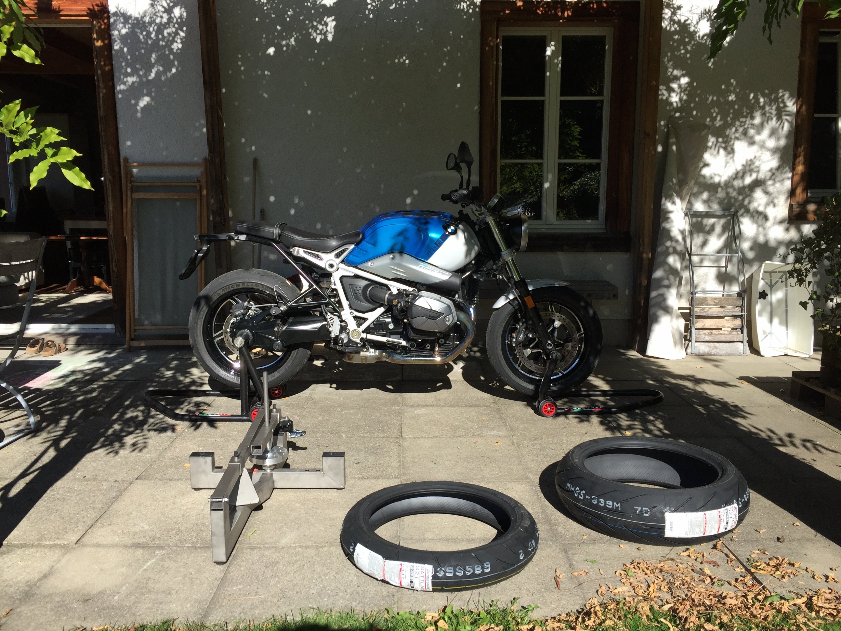 Die S22 hatte ich ja schon mal auf der S 1000 R montiert und sie waren auch heute sehr hart und nur widerspenstig zu montieren. Drückt man sie am einen Ende mit dem Montageschuh ins Felgenbett, drehen sie sich auf der anderen Seite wieder heraus. Trotzdem insgesamt immer wieder eine erfreuliche Geschichte, Reifen selbst zu montieren.