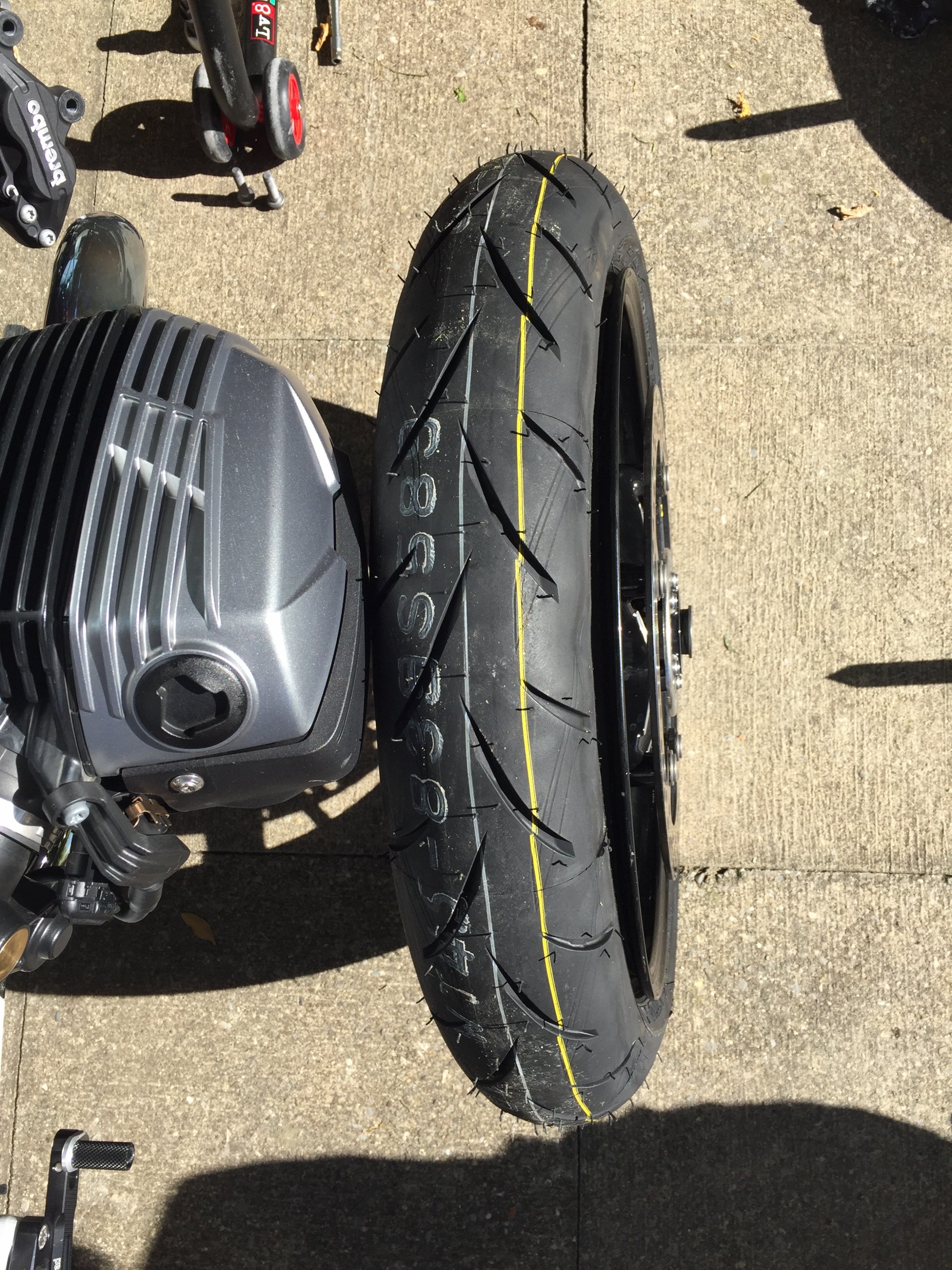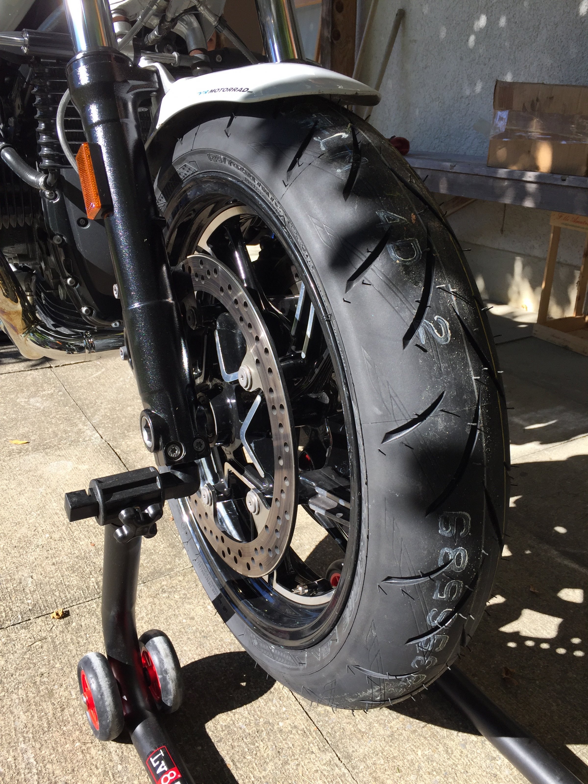 Nachdem die Road 5 nach 2700 km zu wenig von dem haftfähigen Gummi noch auf den Schultern hatten (Mogelpackung), mussten heute richtige Sportreifen drauf: